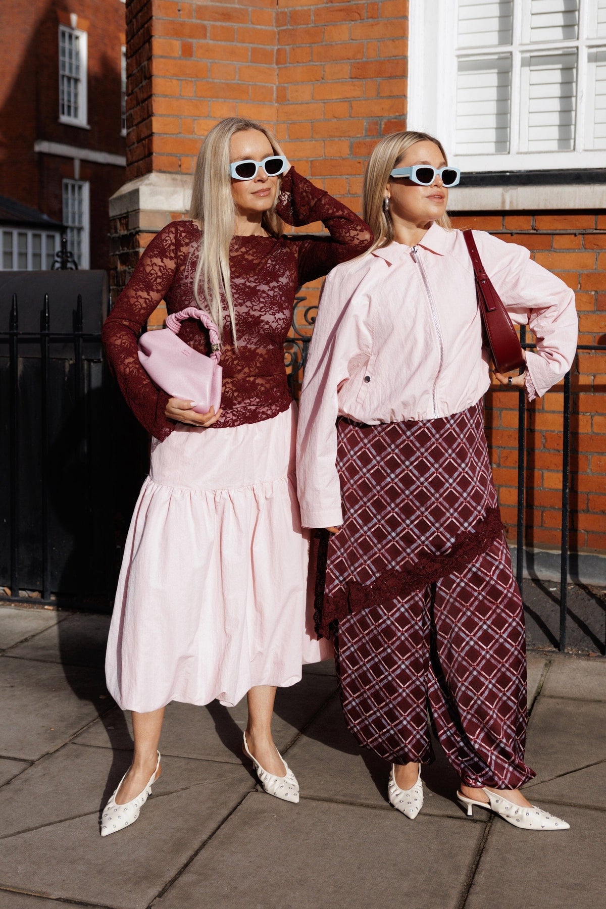 Byxor från Cras, gjorda av återvunnen polyester i ett rutigt mönster med bordeaux, röda och blå nyanser. Dessa byxor har hög midja.