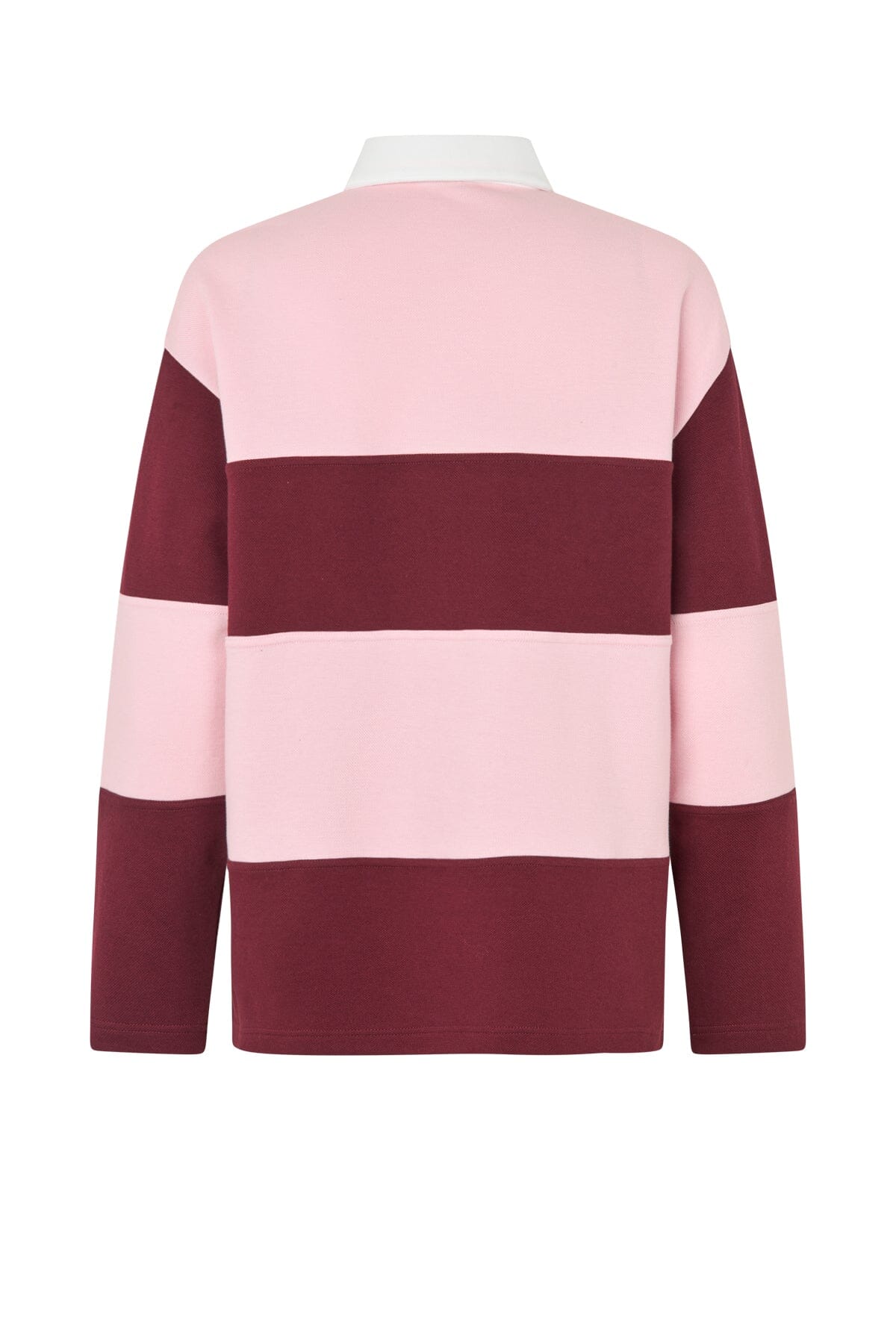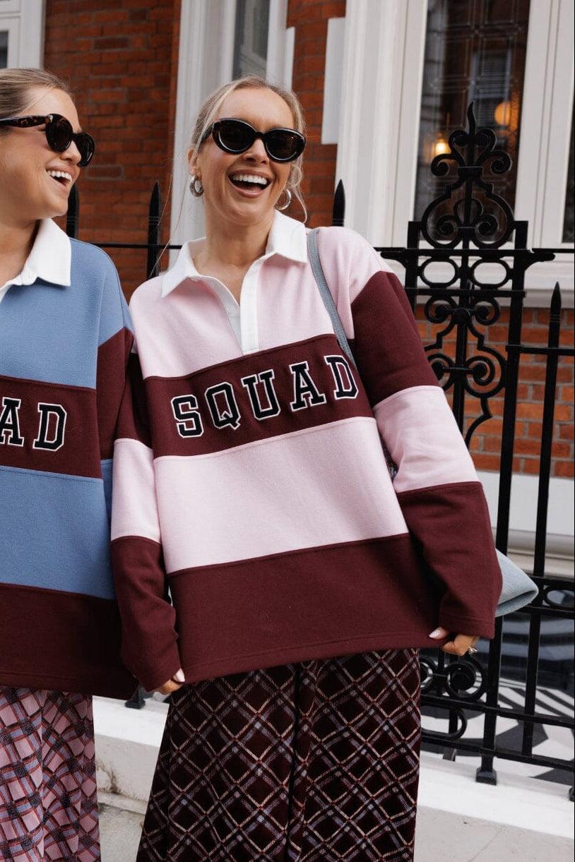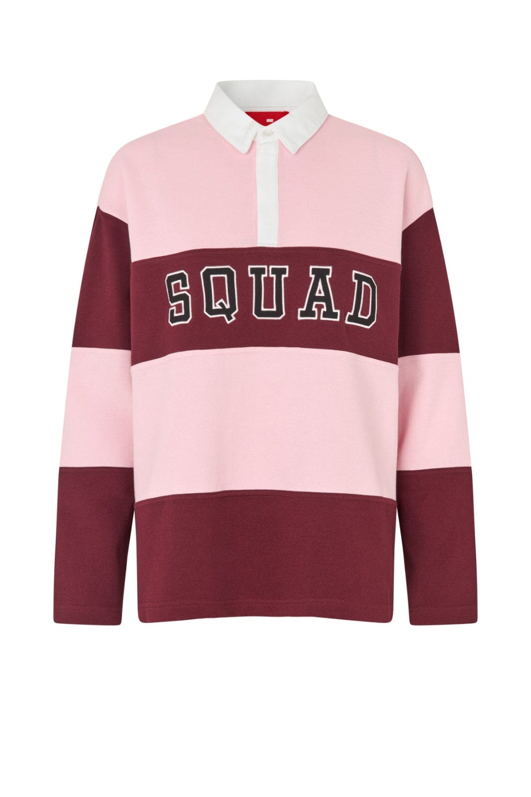 Pikétröja från Cras i rosa med ränder i pink och mörkbrunt. Tröjan har vit krage och SQUAD-tryck på bröstet.