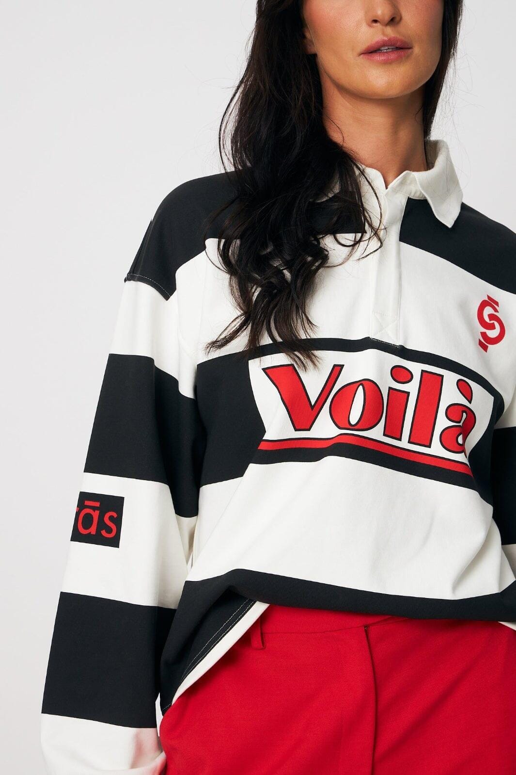 Svart och elfenbensfärgad blus från Cras med ränder och grafiskt Voilà-tryck i röd. Blusen har en oversized passform med polokrage och långa ärmar.