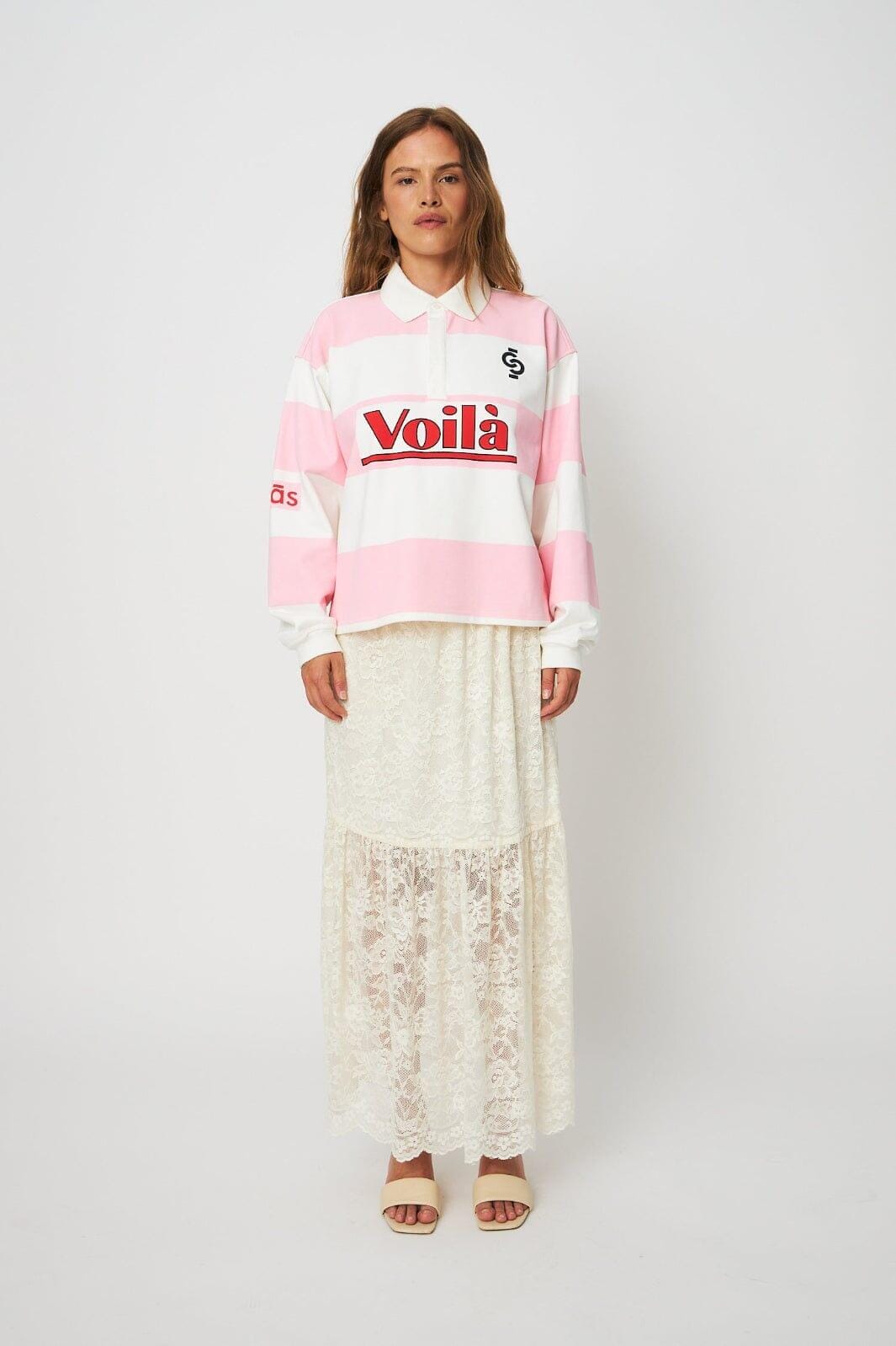 Rosa och vit blus från Cras med ränder och polokrage. Den oversized blusen har långa ärmar och broderad Voilà-text på framsidan. Cras-logotypen är synlig på ärmen.