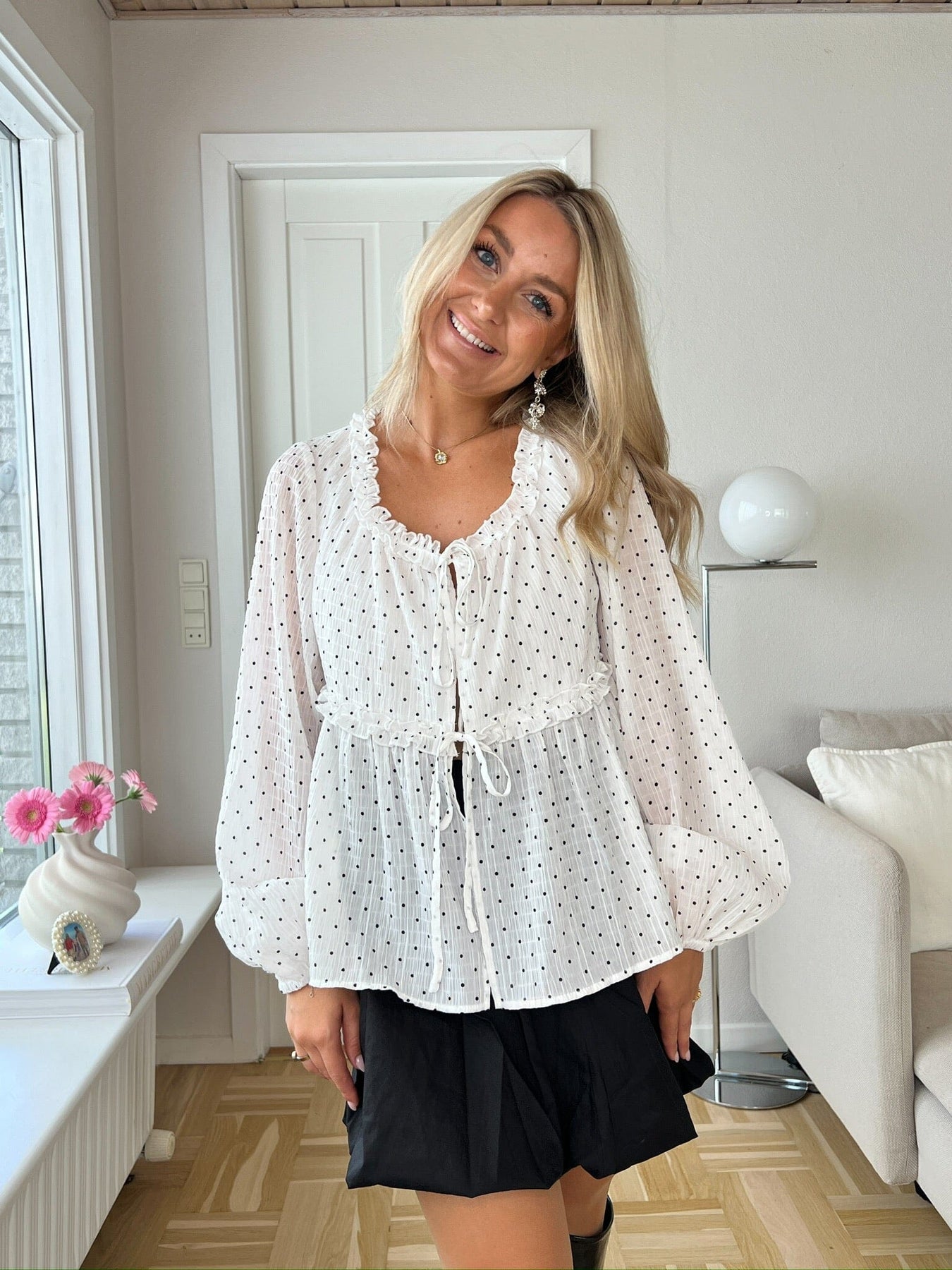 Vit blus med svarta prickar från Dear Molly. Blusen har långa ärmar och en rund halsringning med volanger.