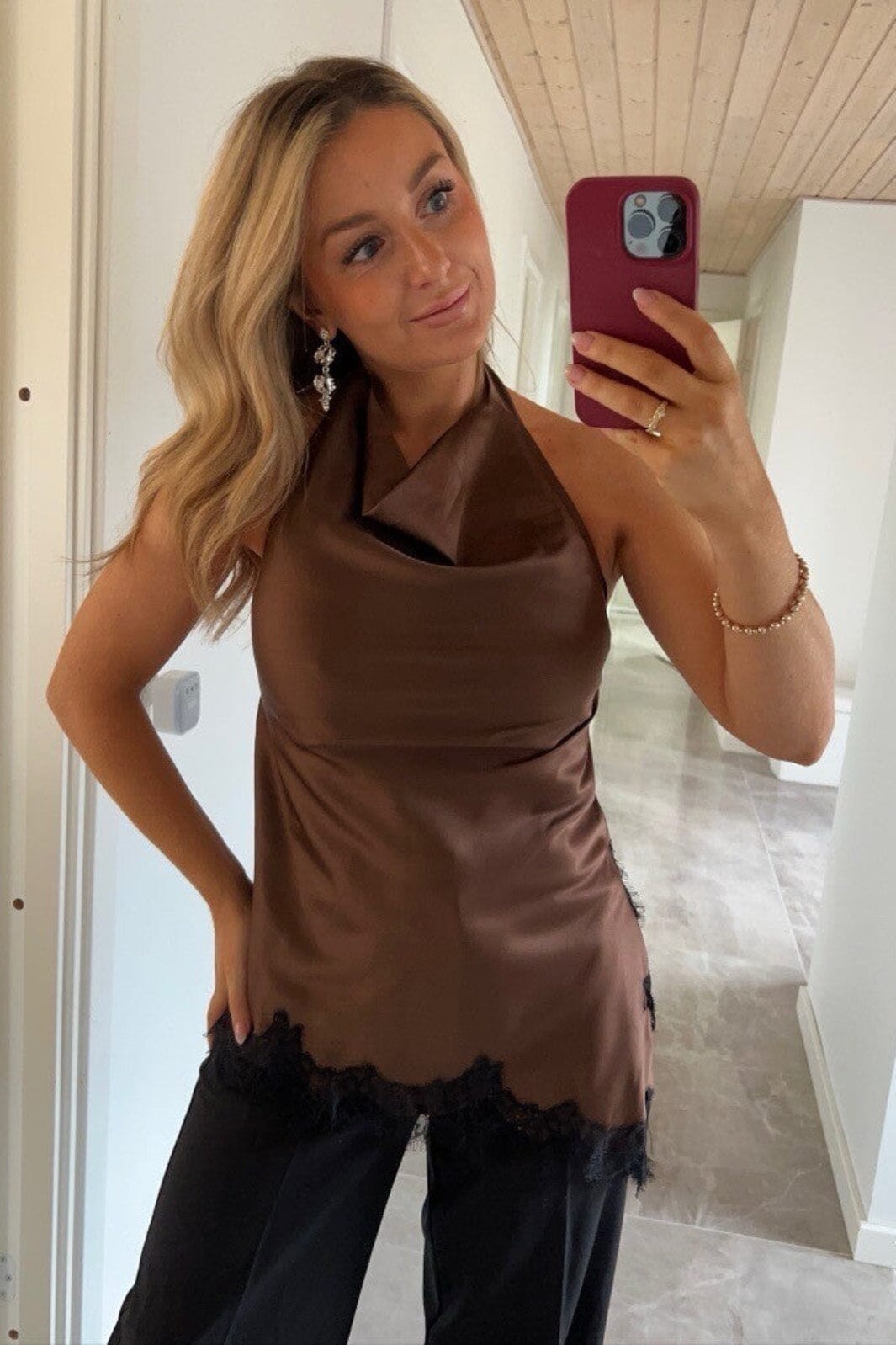 Halterneck-topp från Dear Molly i brun färg. Toppen har spetskant längs kanten och en draperad halsringning i halterneck-stil.