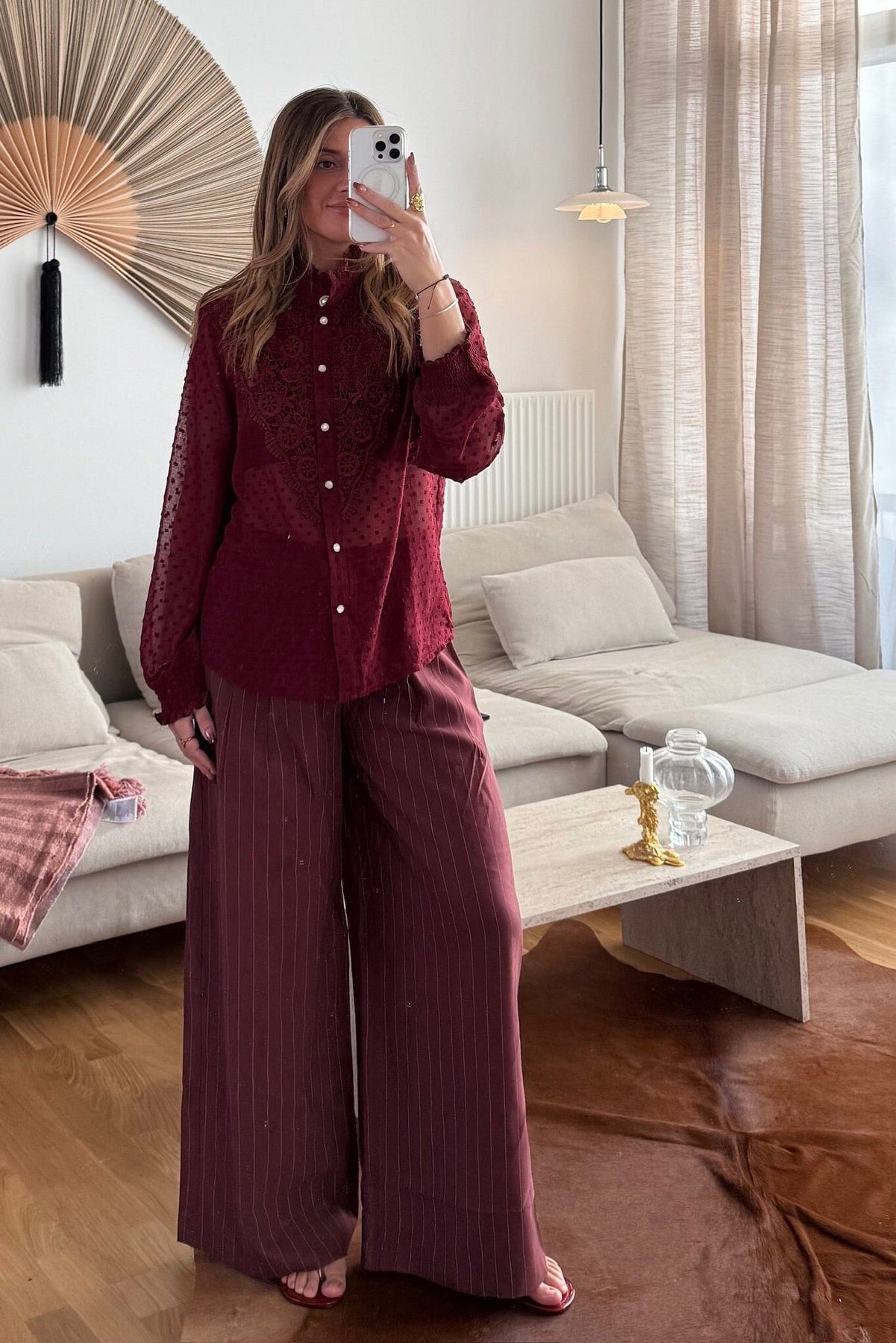 Vinröd skjorta från Dear Molly med blommönster och prickigt polkamönster. Skjortan har broderi, pärldetaljer och volanger, och den stängs med knappar.