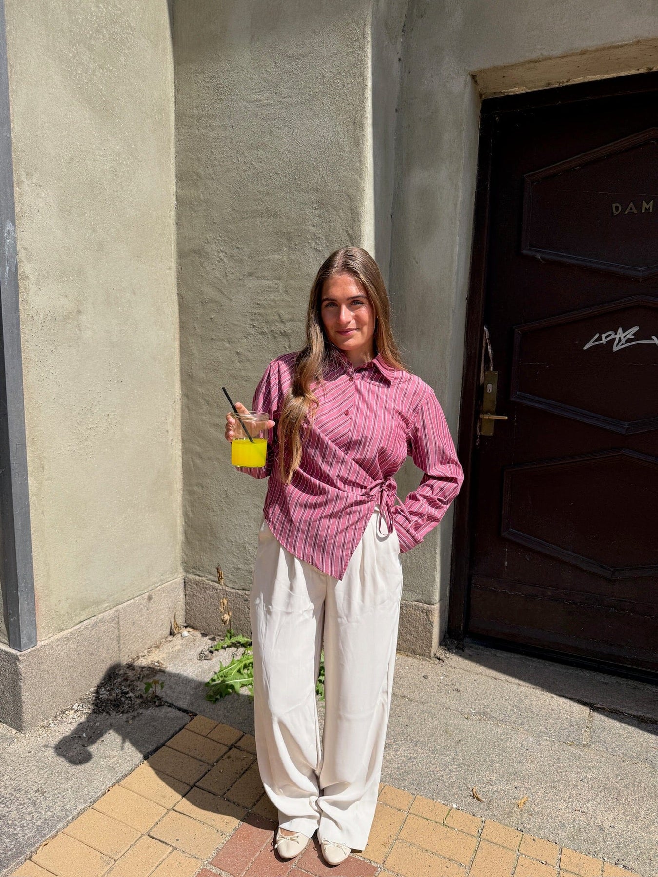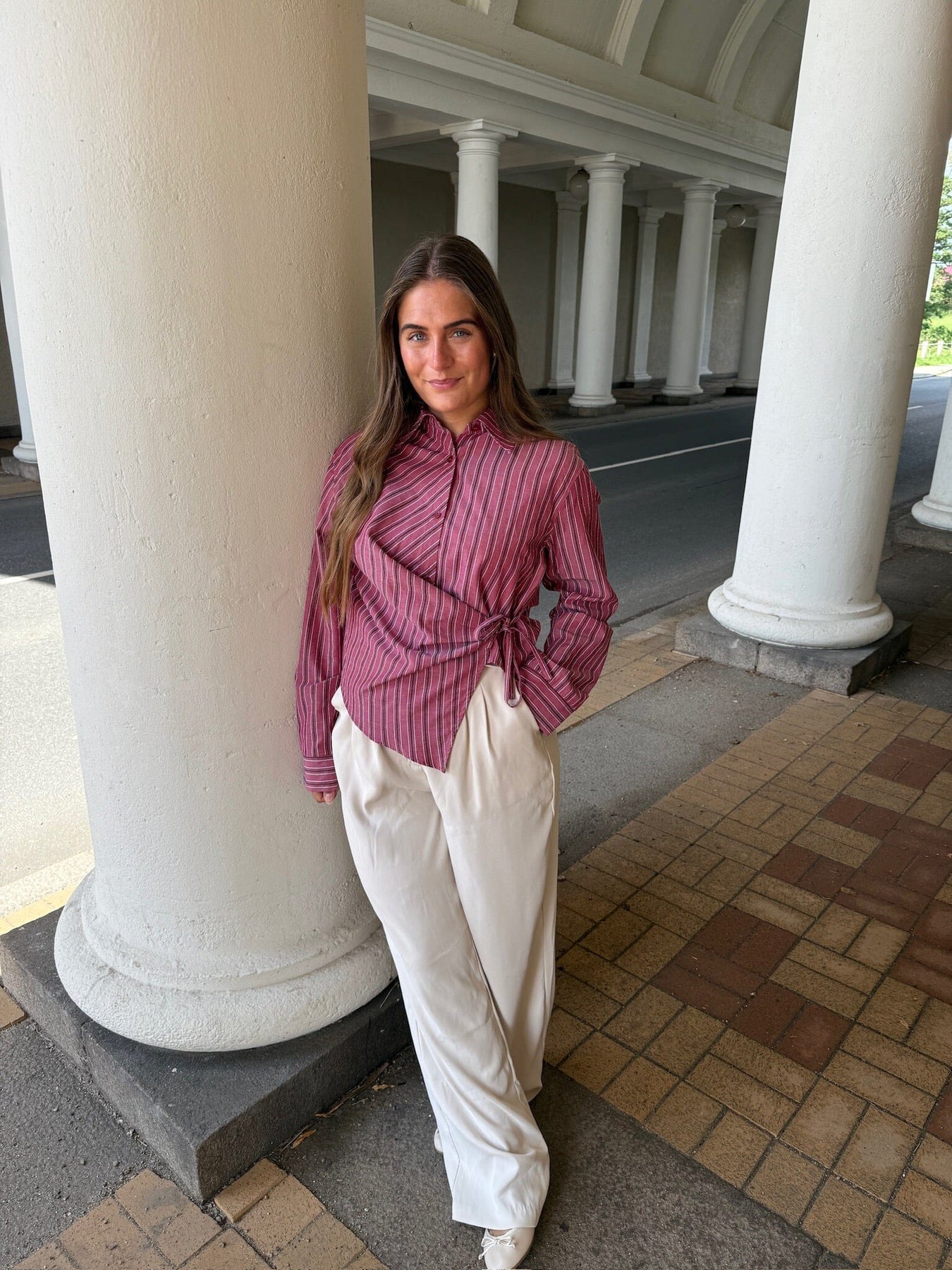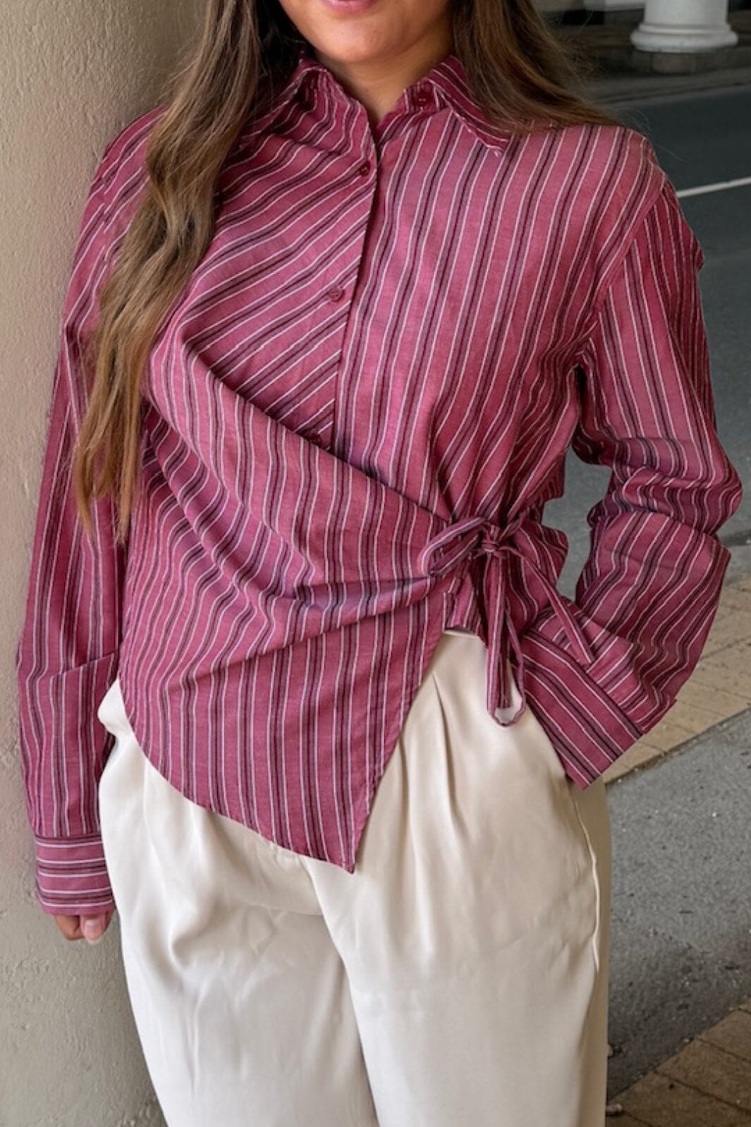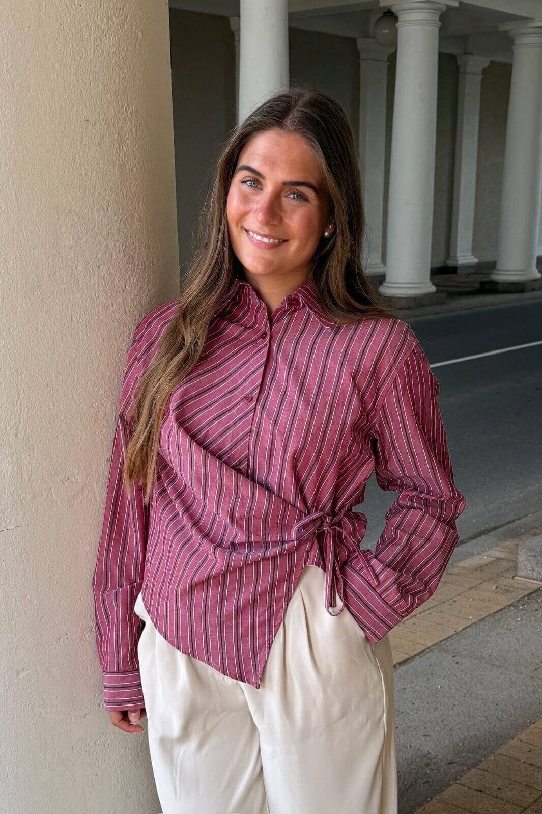 Vinröd randig skjorta från Dear Molly. De vertikala ränderna på den vinröda botten ger skjortan ett grafiskt uttryck.