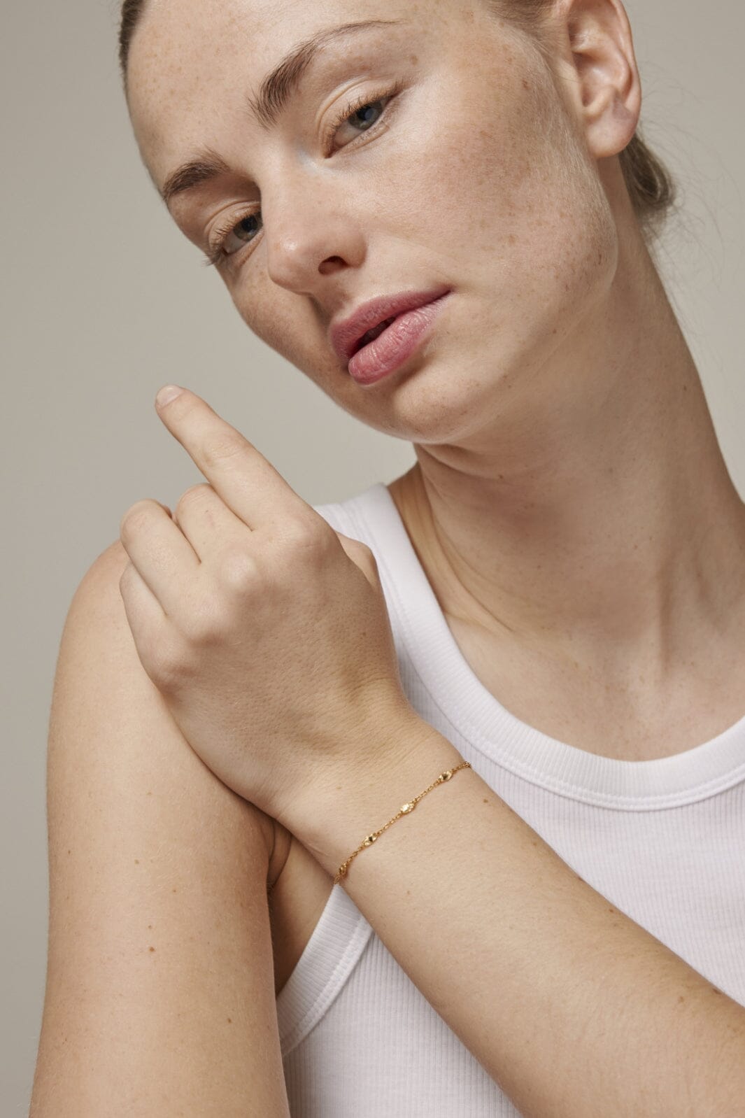 Handgjort armband från Enamel Copenhagen med kedjedesign och texturerade element. Armbandet har små, runda detaljer längs kedjan och är belagt med 18 karat guld.