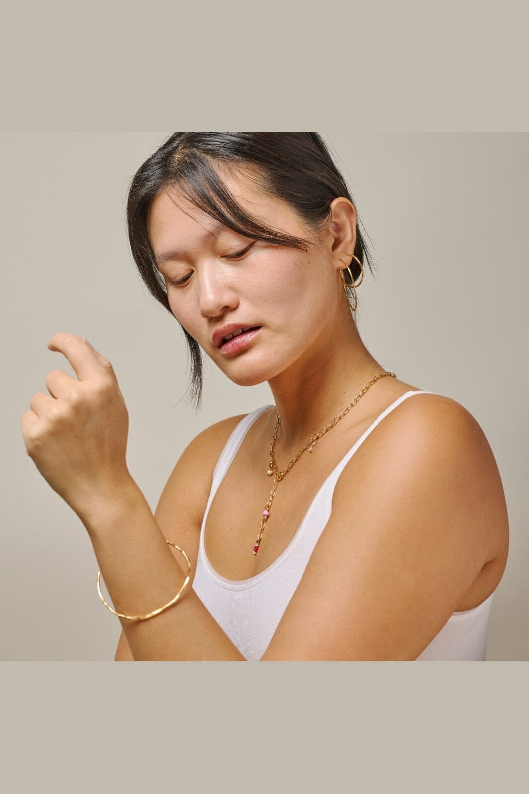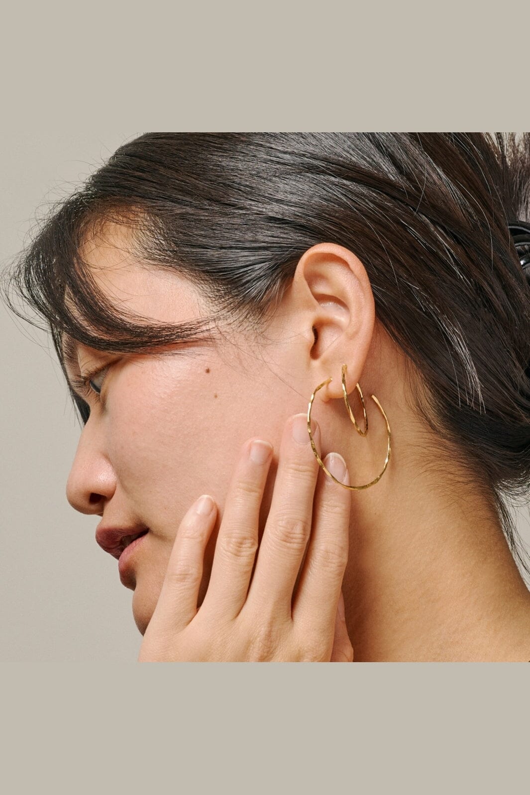 Hoops från Enamel Copenhagen med en organisk och ojämn yta. Örhängena är guldfärgade och har en cirkulär form med ett livfullt ljusspel.