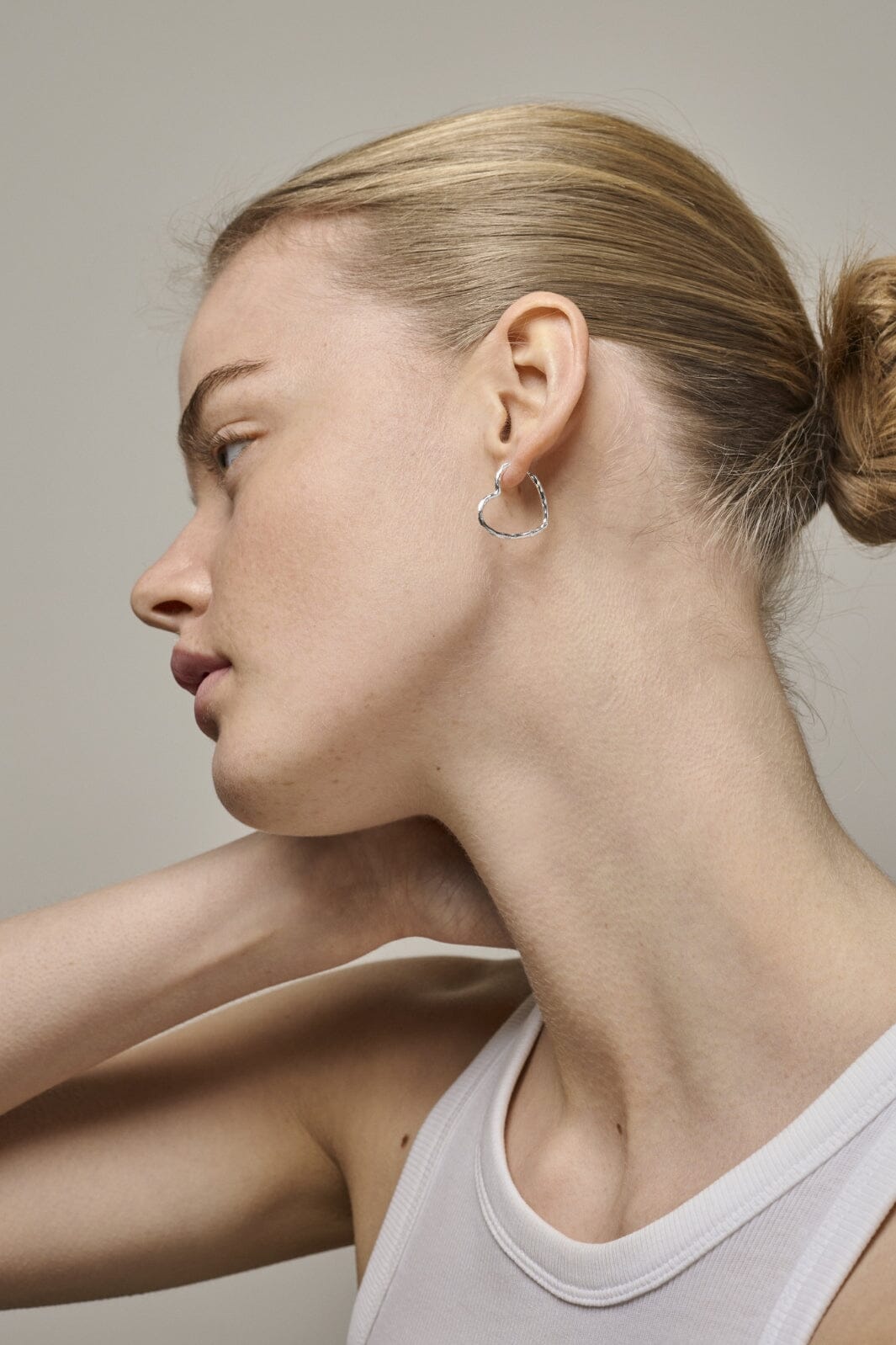 Hjärtfomade örhängen från Enamel Copenhagen med en särskilt strukturerad yta. De handgjorda örhängena är synliga från sidan och har en tydlig hjärtsiluett.