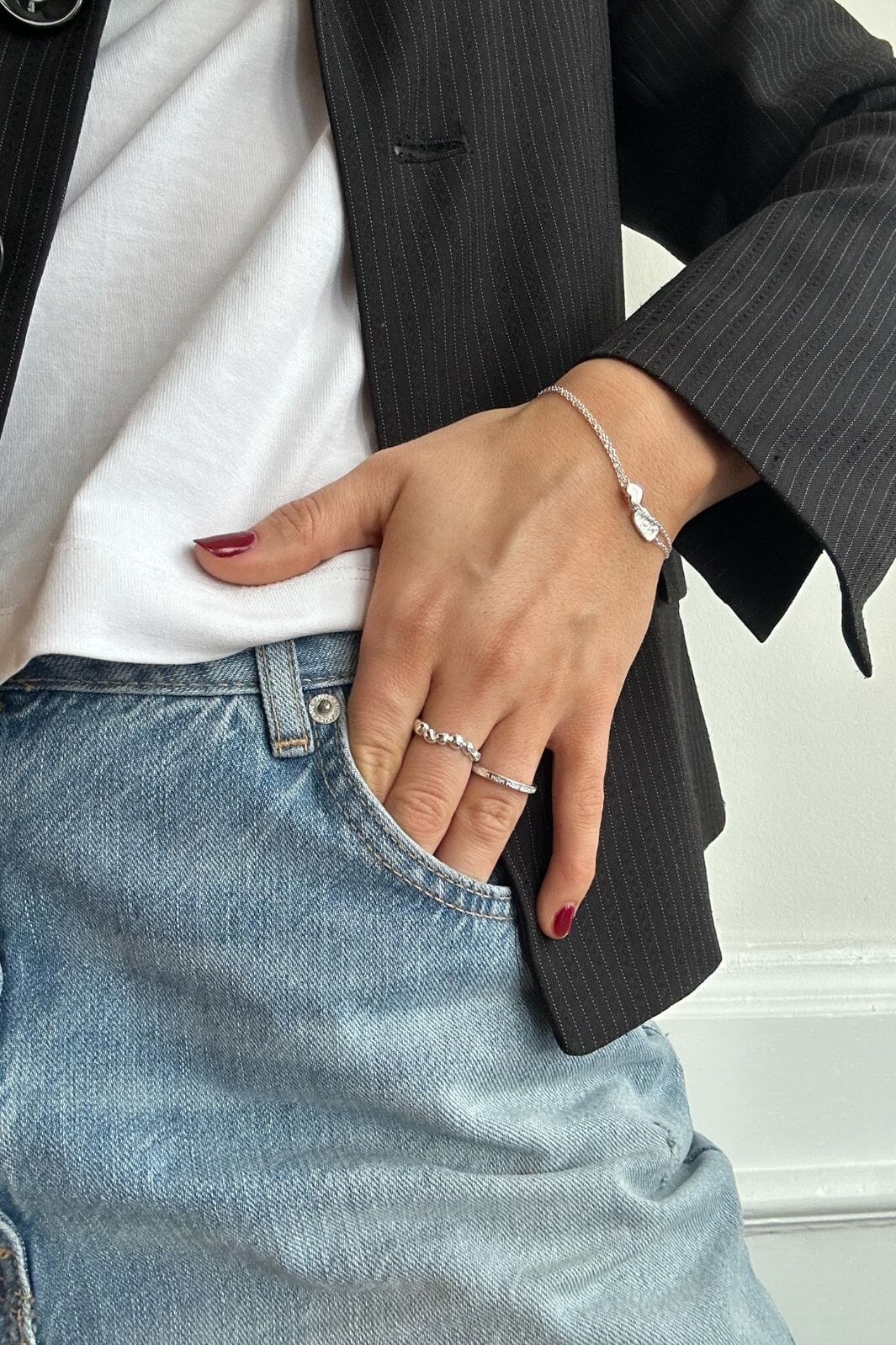 Ring från Enamel Copenhagen, tillverkad av återvunnet sterlingsilver. Ringen har en design med klotformade segment i en silverfärgad nyans.