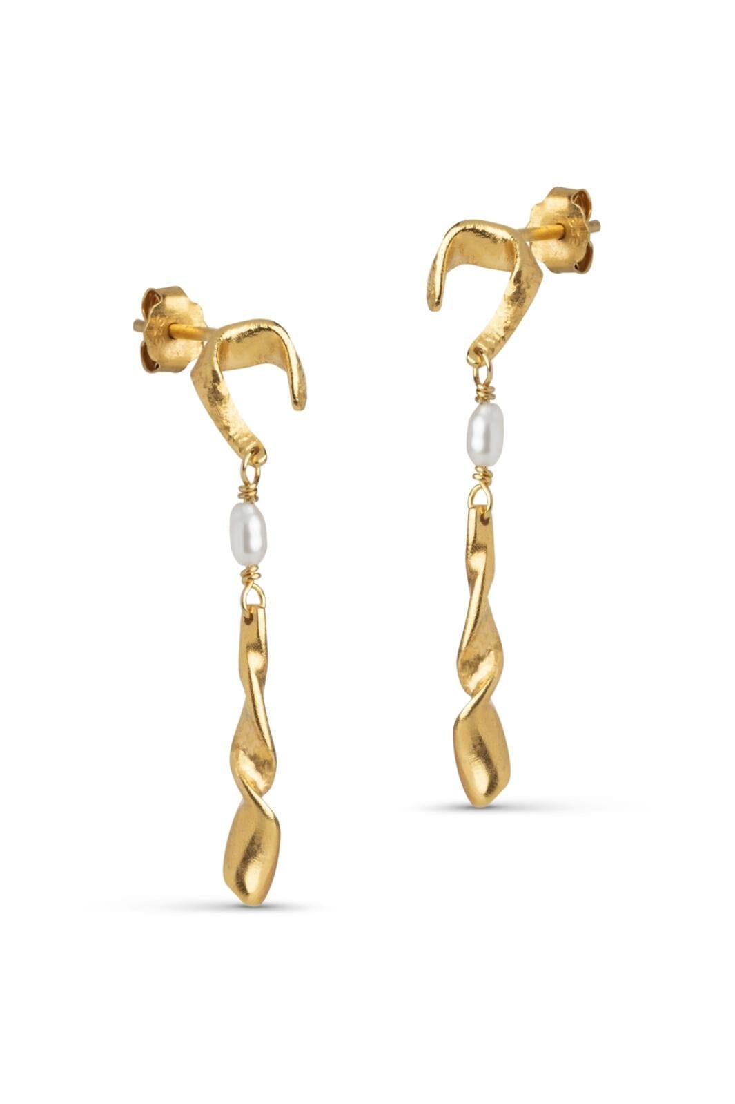 Guldpläterade örhängen från Enamel Copenhagen med snurrande metalldesign och sötvattenspärla. Smycket har en konstnärlig utformning med en pärla placerad i mitten.