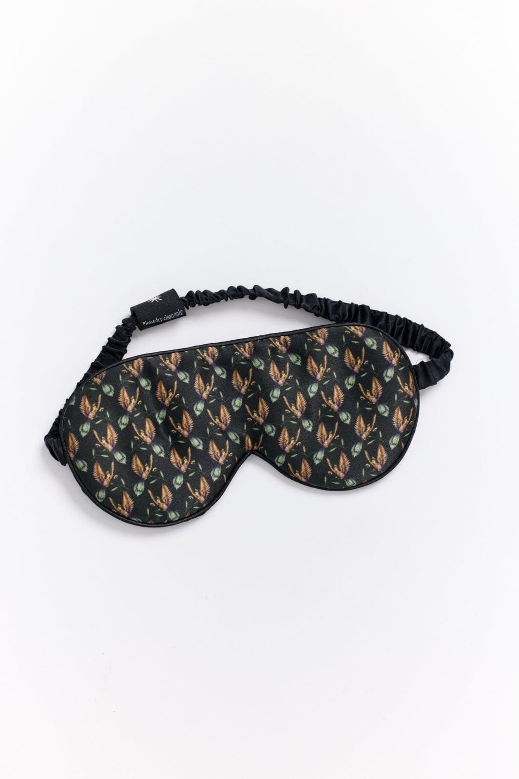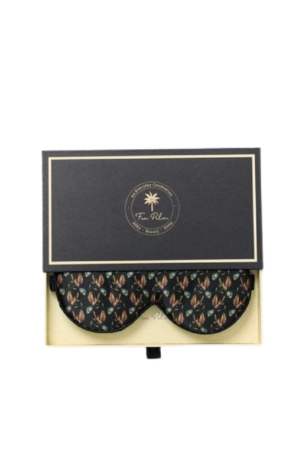 Svart sovmask från Fan Palm med kolibriblommönster. Sovmasken är tillverkad av mulberrysilke och kommer i en dekorativ låda som skyddar produkten.