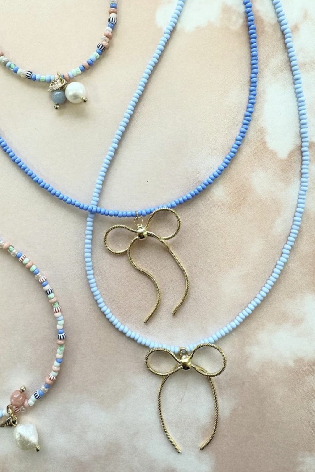 Ett halsband med sløjfformad hänge i guldfärgat metall. De ljusblå pärlor går hela vägen runt om kedjan och skapar en fin kontrast.