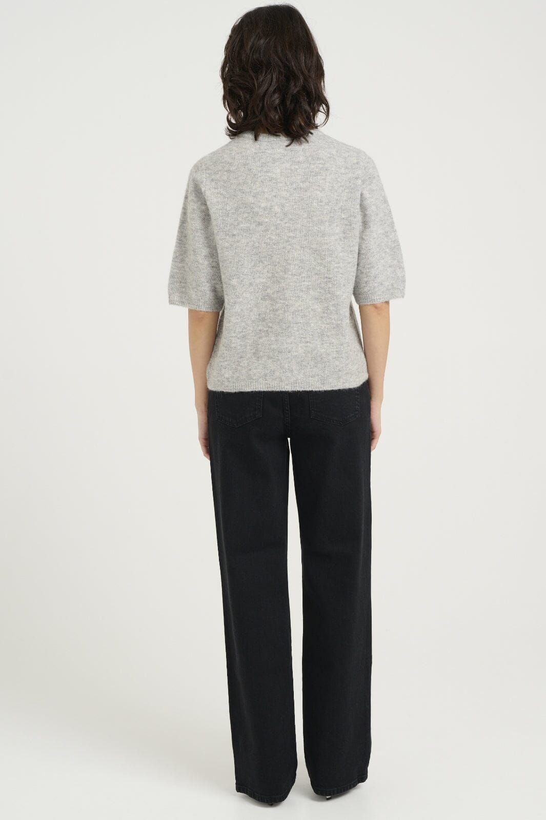 Ljusgrå t-shirt från Gestuz med trekvartsärmar och rund halsringning. T-shirten har en mjuk och lätt fluffig textur med ett melerat uttryck.