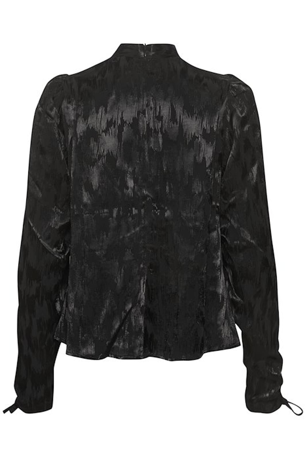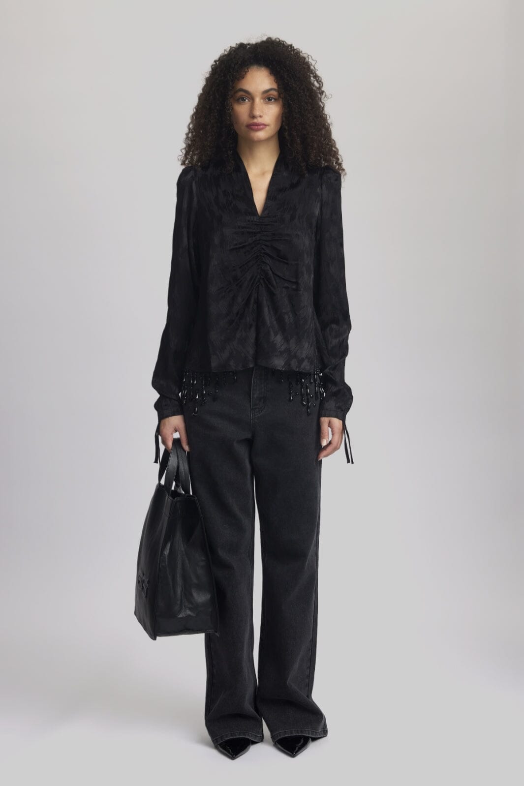 Svart blus från Gestuz med paljetter och volanger. Den har en V-ringning och långa ärmar med snörning. Blusen är tillverkad i ett mönstrat tyg.
