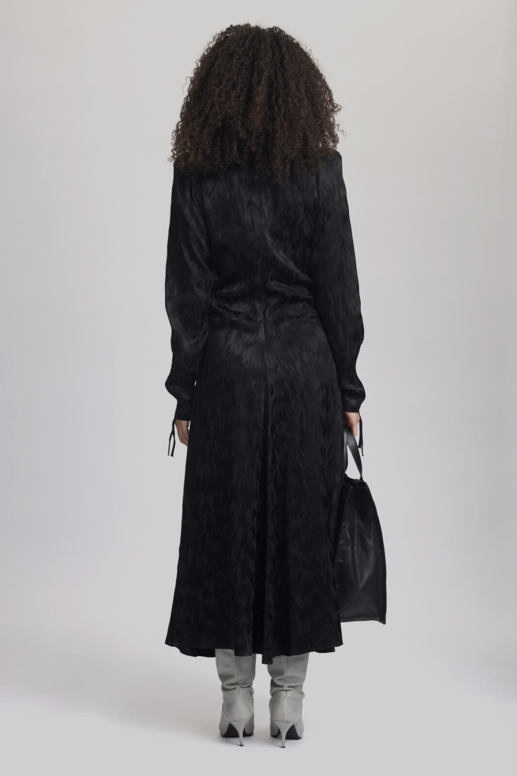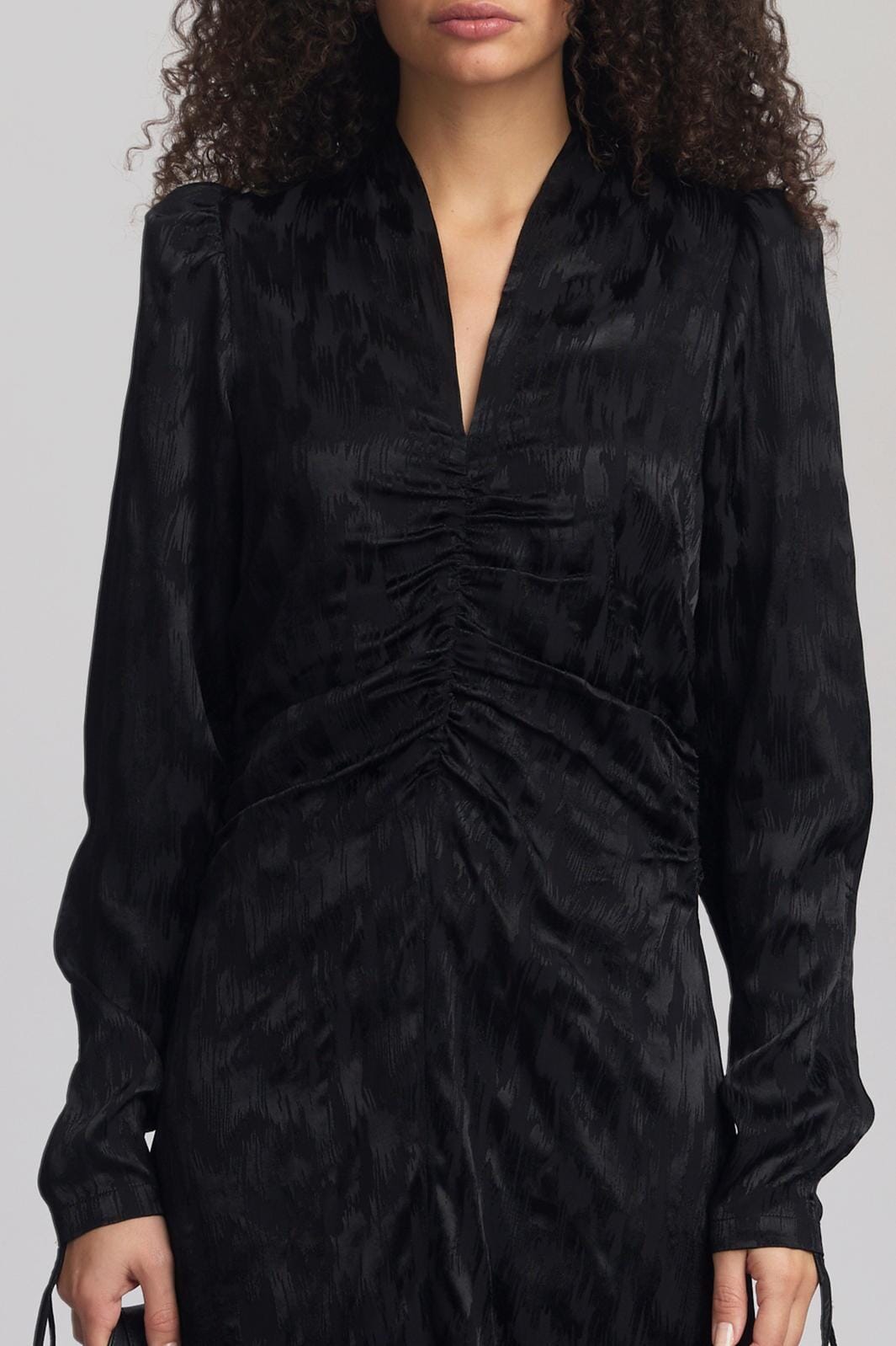 Svart klänning från Gestuz med rynkdetaljer och långa ärmar. Klänningen har V-ringning och går till mitten av vaden. Tyget har en strukturerad yta med tryck.