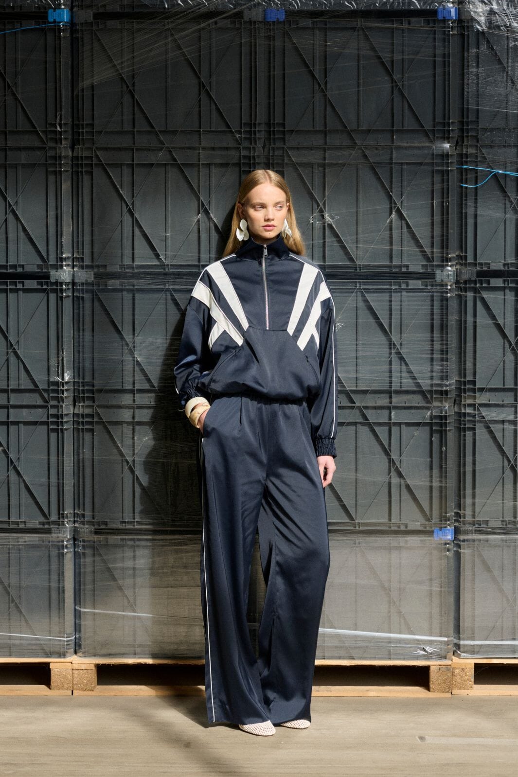Anorak från Gestuz i mörkblått med vita grafiska ränder. Den har hög hals, halv dragkedja och elastiska muddar.