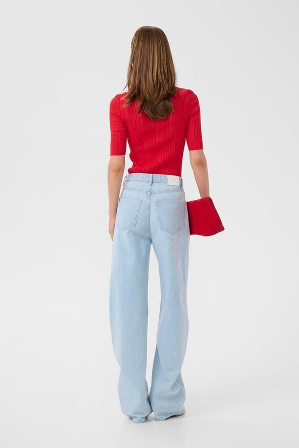 Röd polotopp från Gestuz med ribbad textur. Toppen har en polokrage med knappar framtill och korta ärmar.