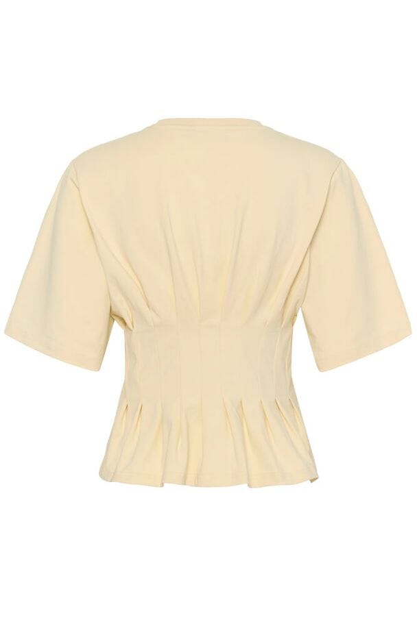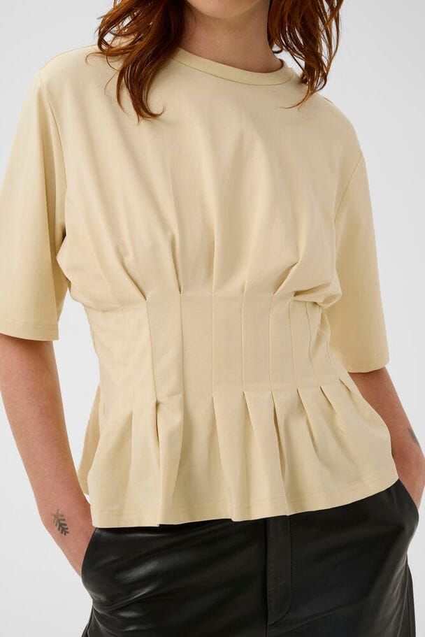 En ljus cremefärgad t-shirt från Gestuz med plisserad design runt midjan. Den har korta ärmar och en rund halsringning.