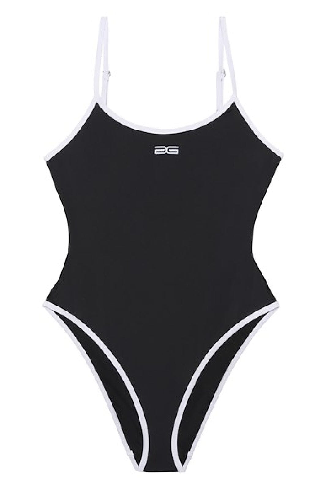 Svart baddräkt från Gestuz med vita kontrastdetaljer. Den höga benöppningen och de tunna banden skapar en sportig stil, medan den dekorativa sömmen tillför fina detaljer.