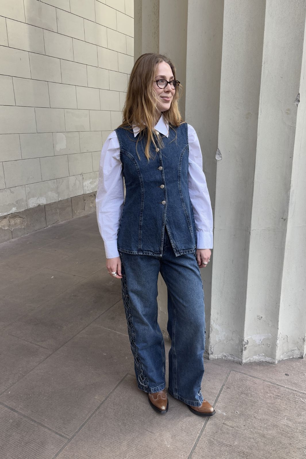 Ärmlös denimväst från Global Funk med rund hals. Västen har en figursydd silhuett med dekorativa sömmar och vita knappar fram.