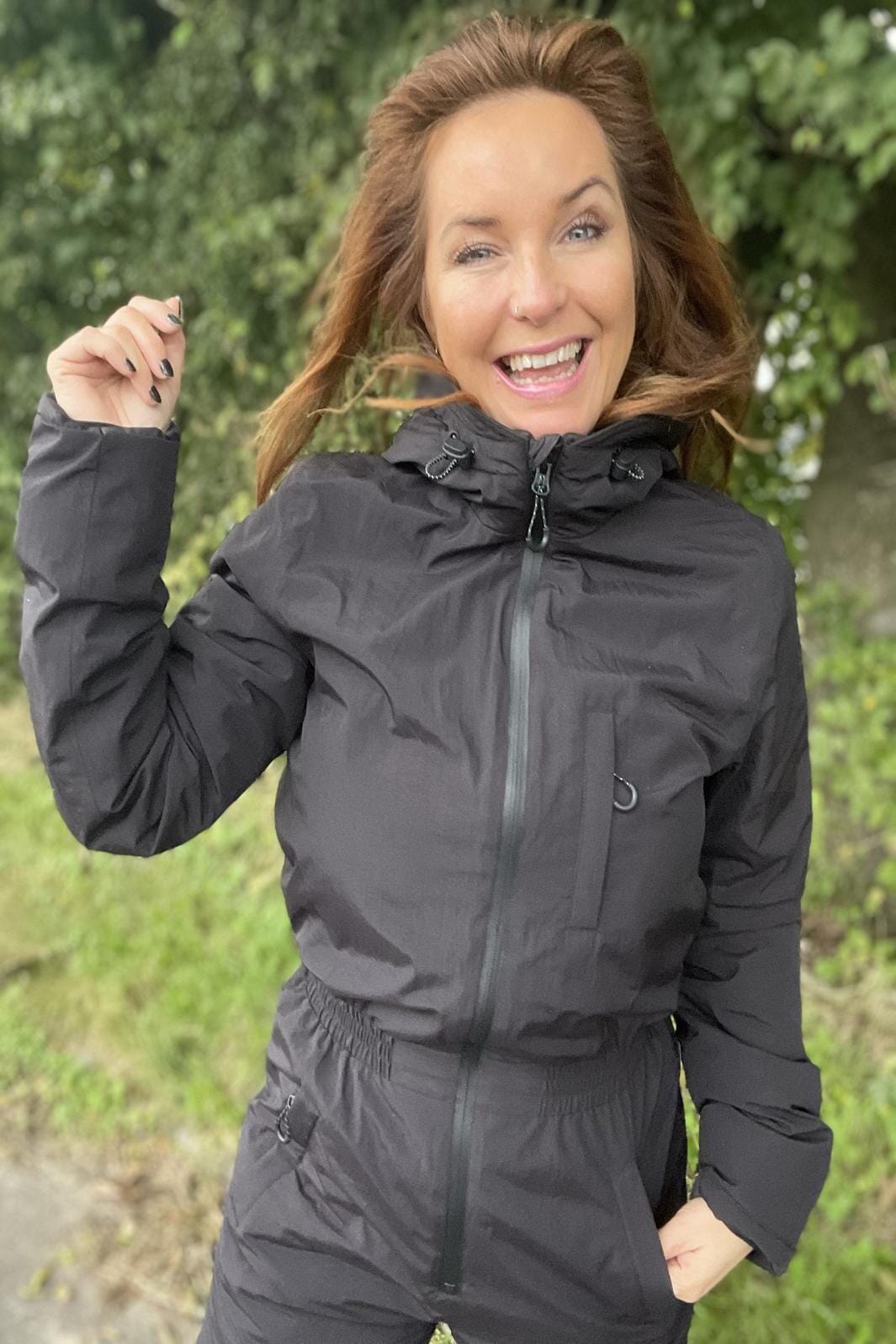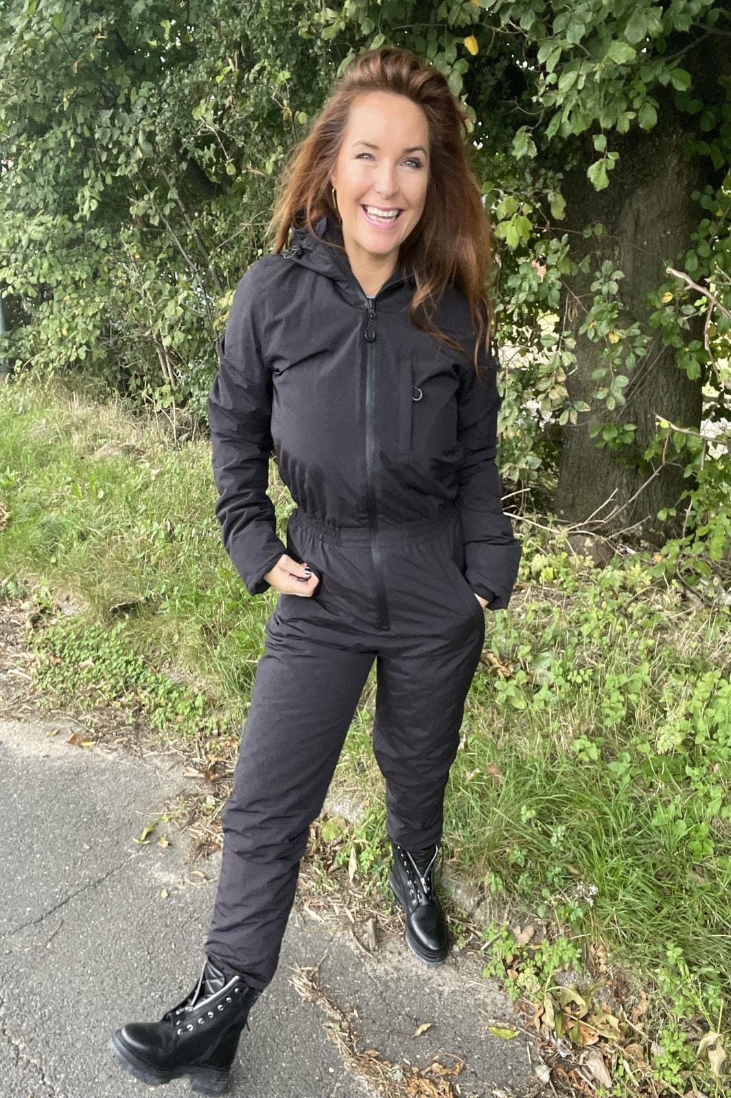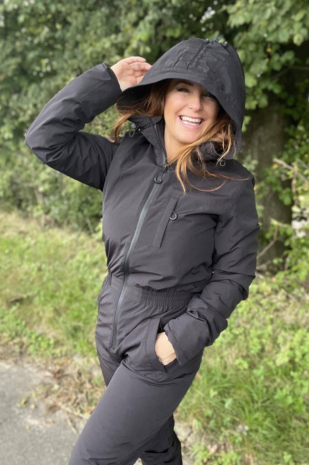 Svart overall med andningsbart material och vattenavvisande egenskaper. Overallen har fleecefoder i överkroppen och huvan samt polyesterfyllning i ärmarna och benen.