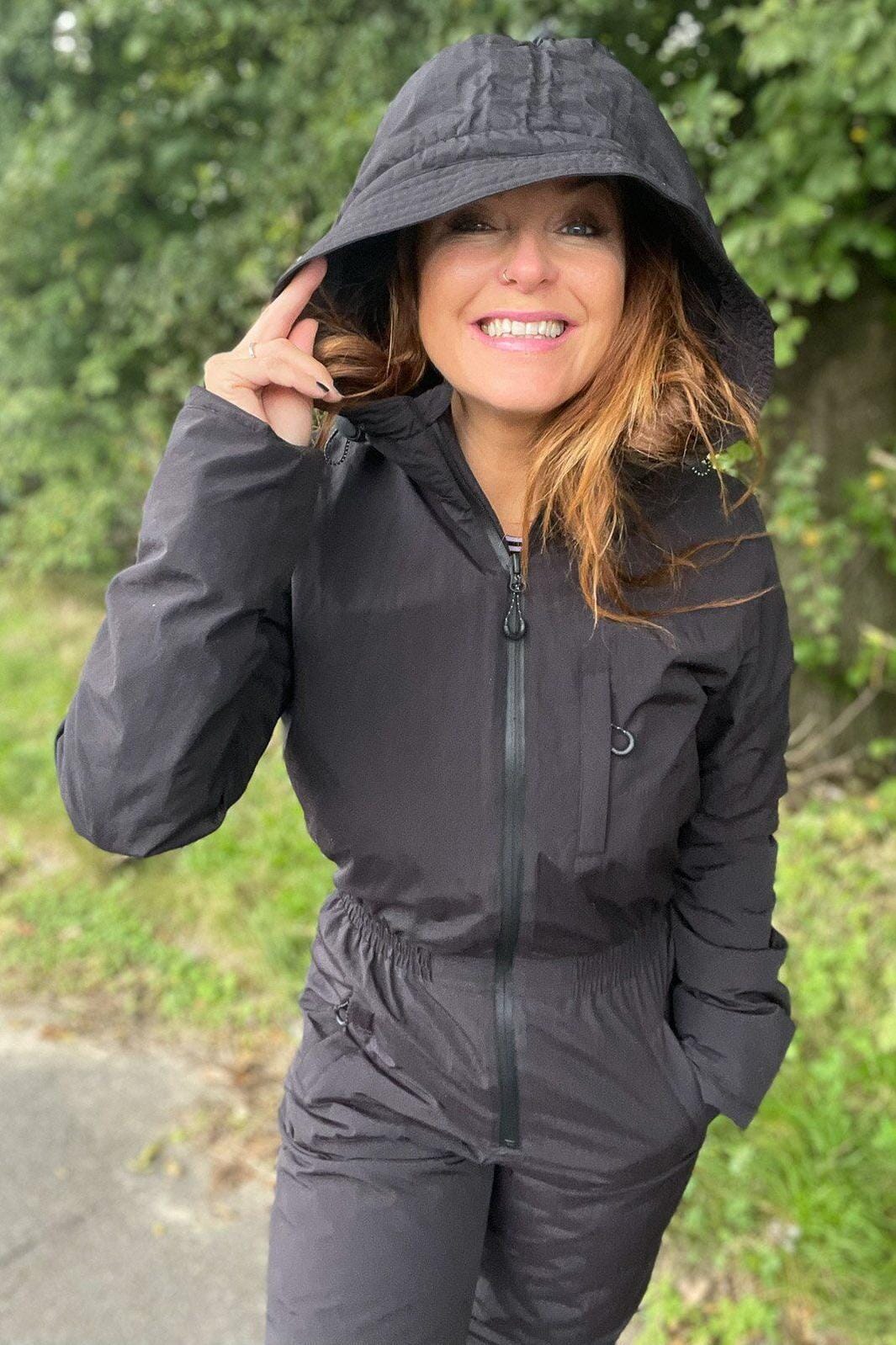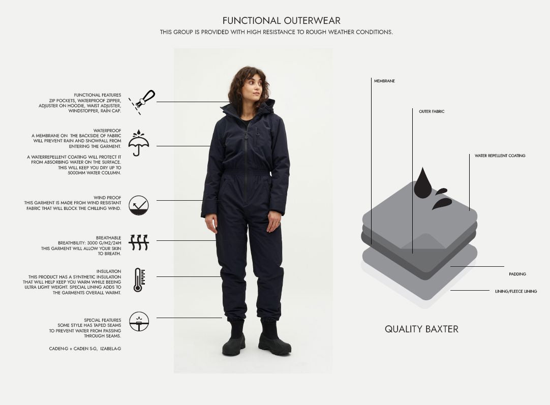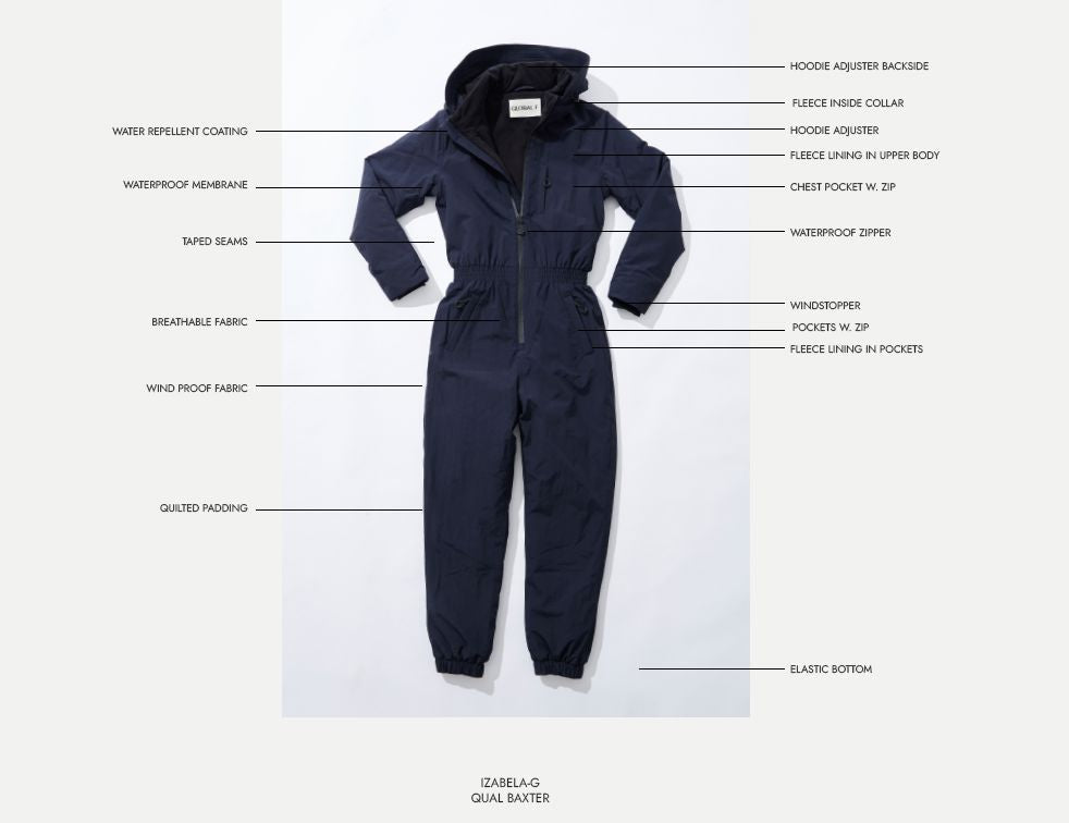 Svart overall med andningsbart material och vattenavvisande egenskaper. Overallen har fleecefoder i överkroppen och huvan samt polyesterfyllning i ärmarna och benen.