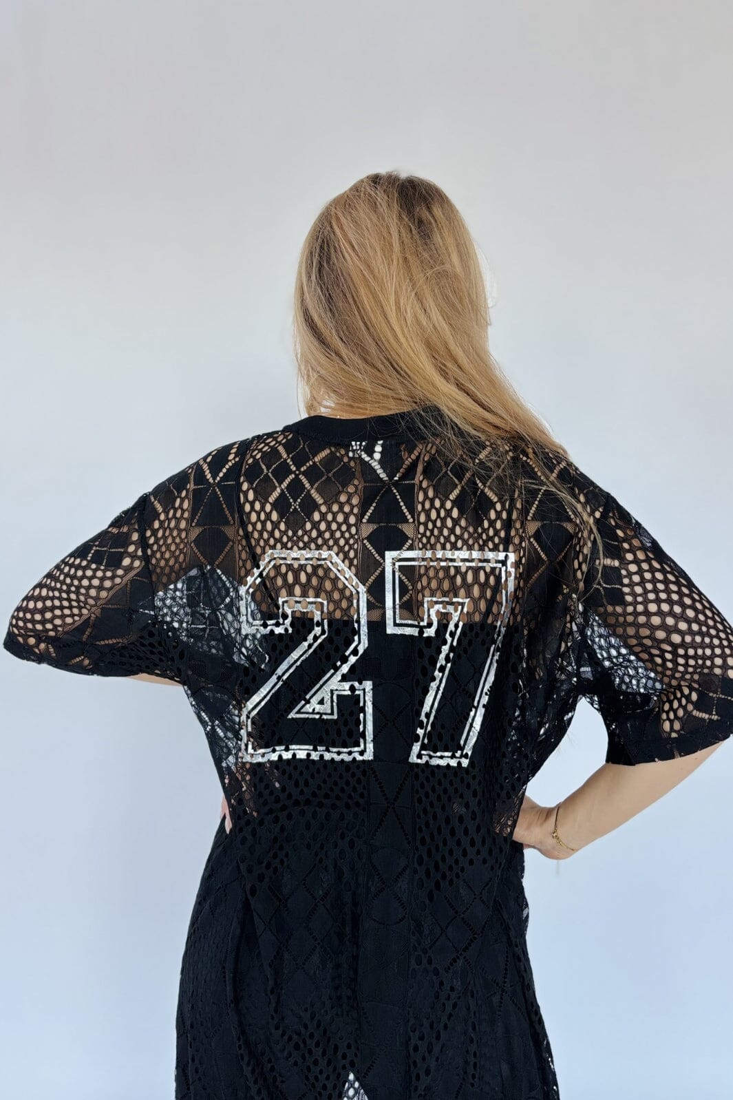 Svart tee-klänning från Gossia med geometriska mönster i nätliknande tyg. Klänningen har korta ärmar och en rund hals med broderi och spetsdetaljer genom hela designen.