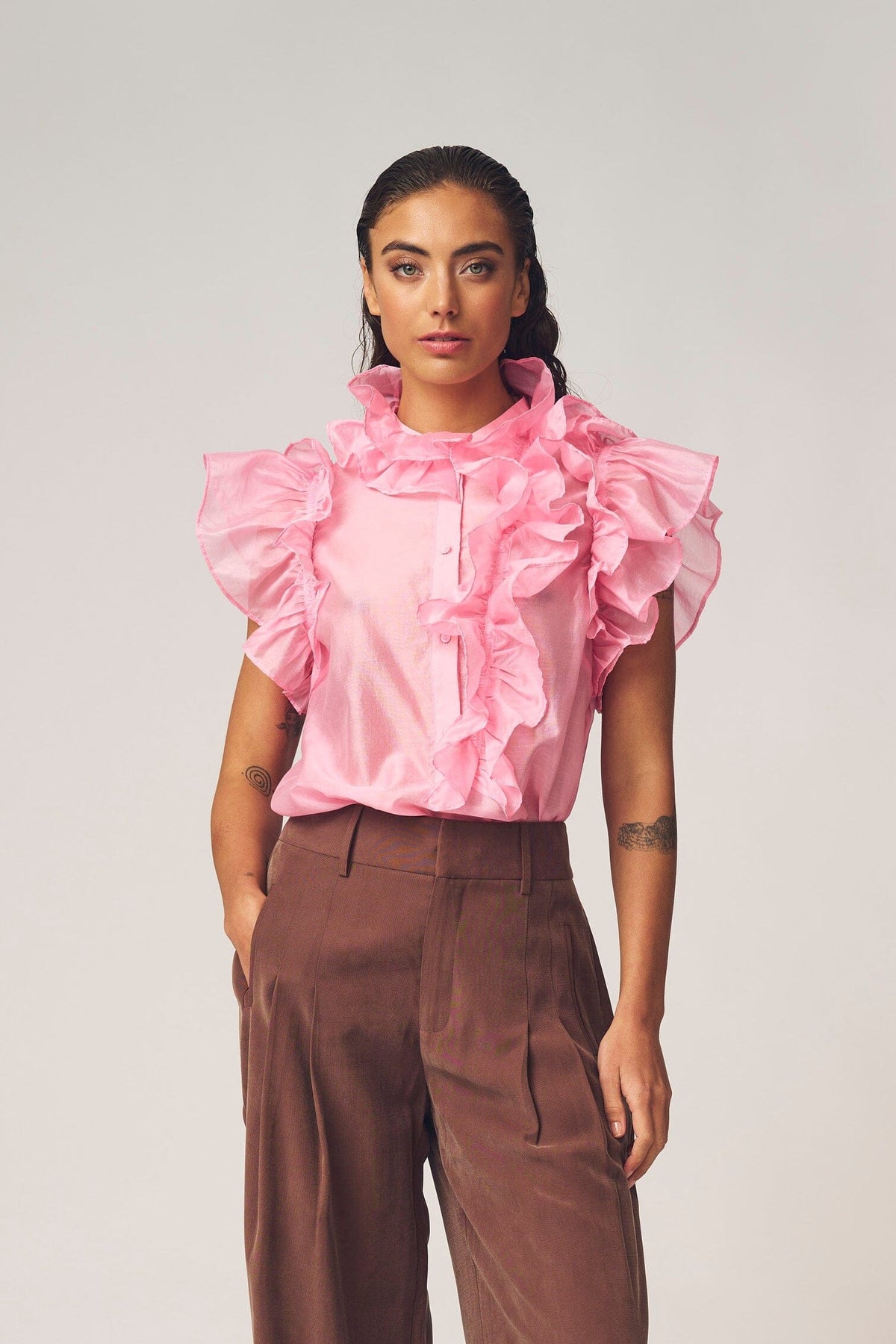 Rosa blus från Gossia, tillverkad av 90% lyocell och 10% polyester. Blusen har markerade volangdetaljer längs framtill och axlarna.