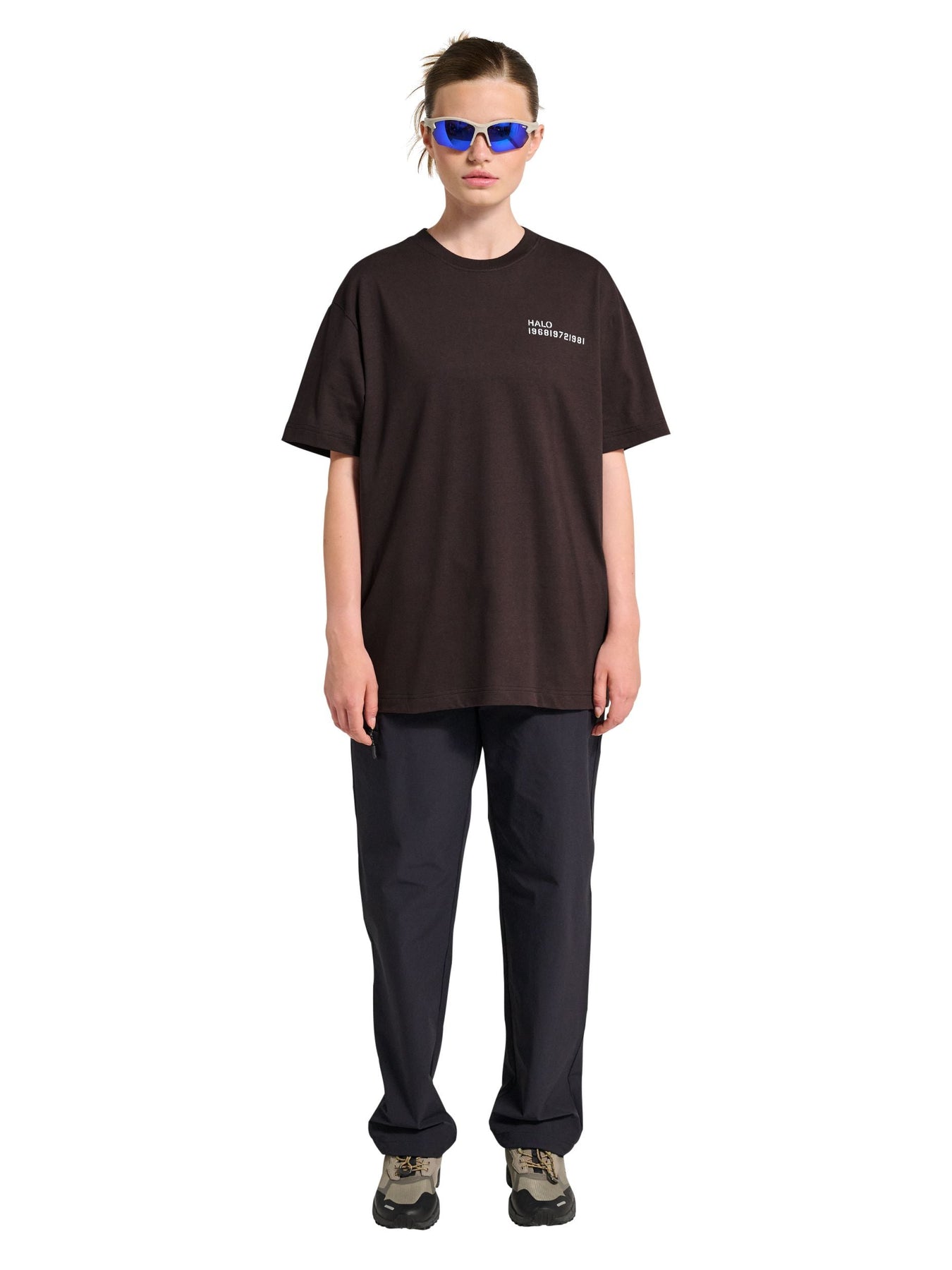 Mörkbrun t-shirt från HALO, tillverkad av 100 % ekologisk bomull. T-shirten har korta ärmar och en lös passform med F.U.T.-text på ryggen.