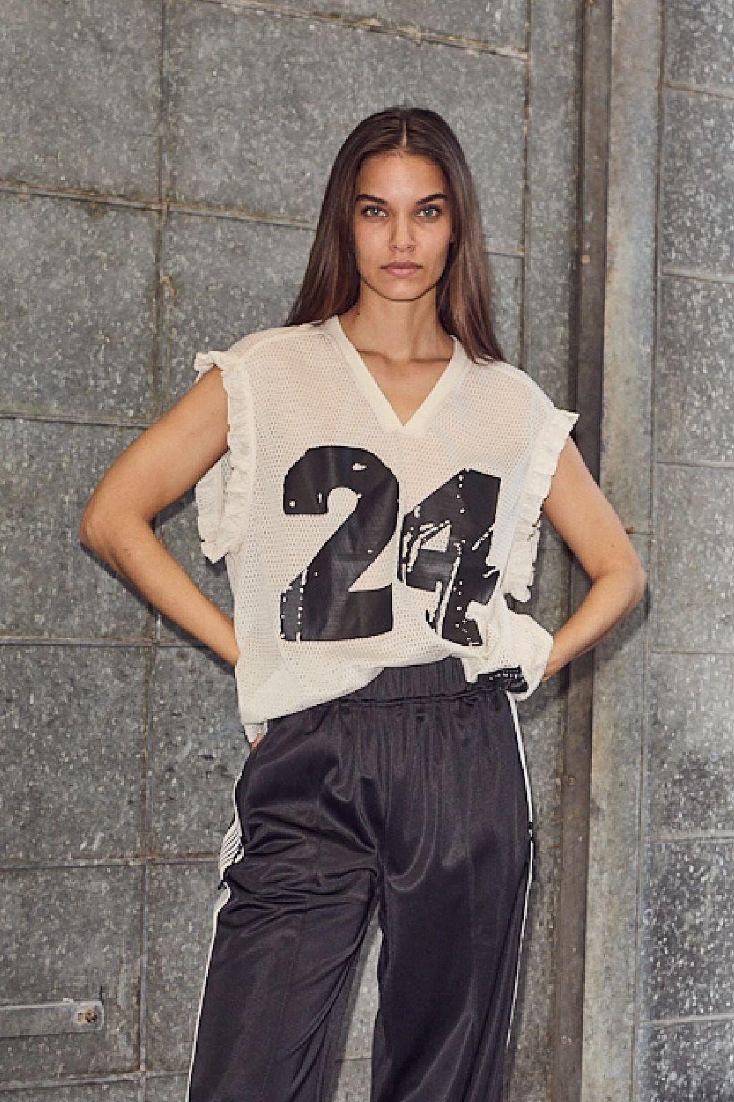 Ärmlös topp från Haute L'Amitié i pärlfärg med V-ringning och volangdetaljer. Toppen har ett stort svart 24-tryck framtill.