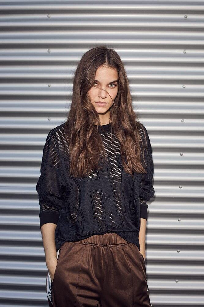 Svart sportblus från Haute L'Amitié i meshmaterial med burnout-tryck. Blusen har långa ärmar och en rund halsringning. Den passar både för träning och vardagsanvändning.