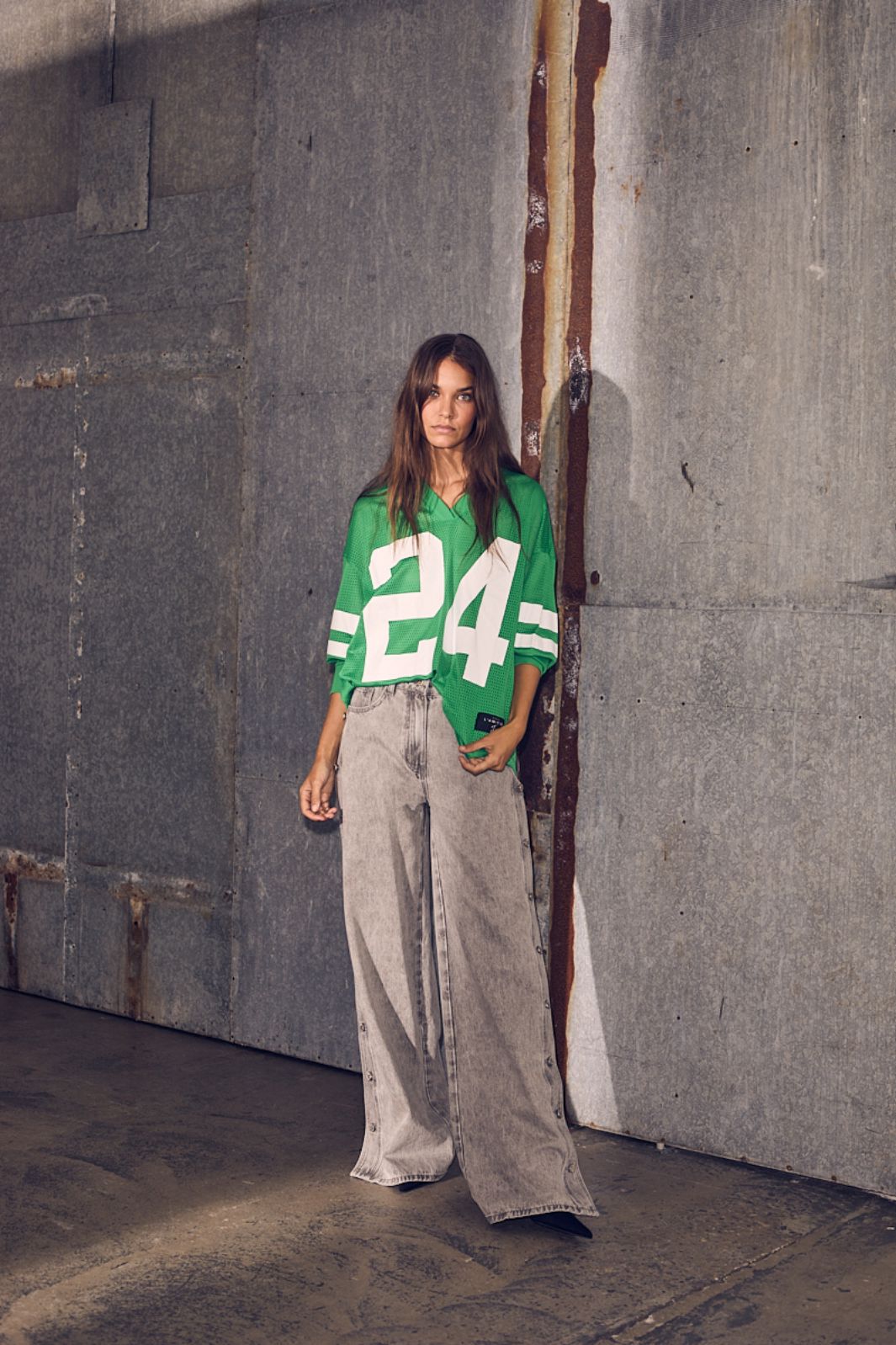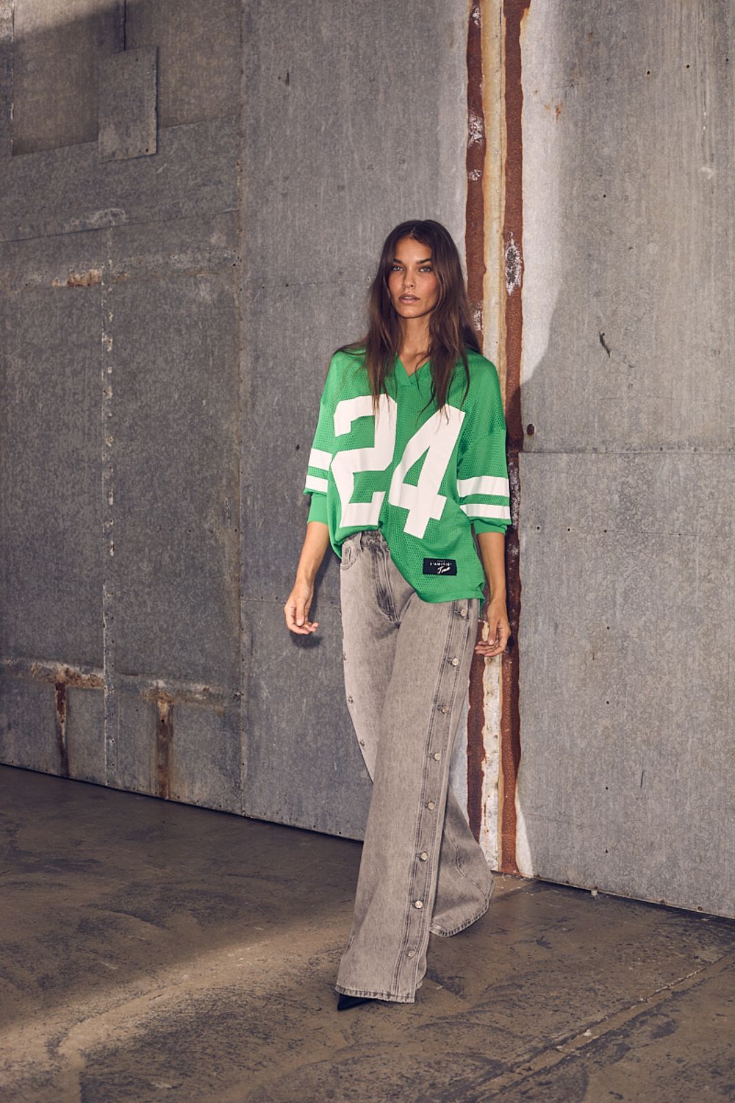 Grön långärmad t-shirt från Haute L'Amitié med mesh-design. T-shirten har en oversized passform och ett stort nummer 24 på framsidan tillsammans med vita ränder på ärmarna.