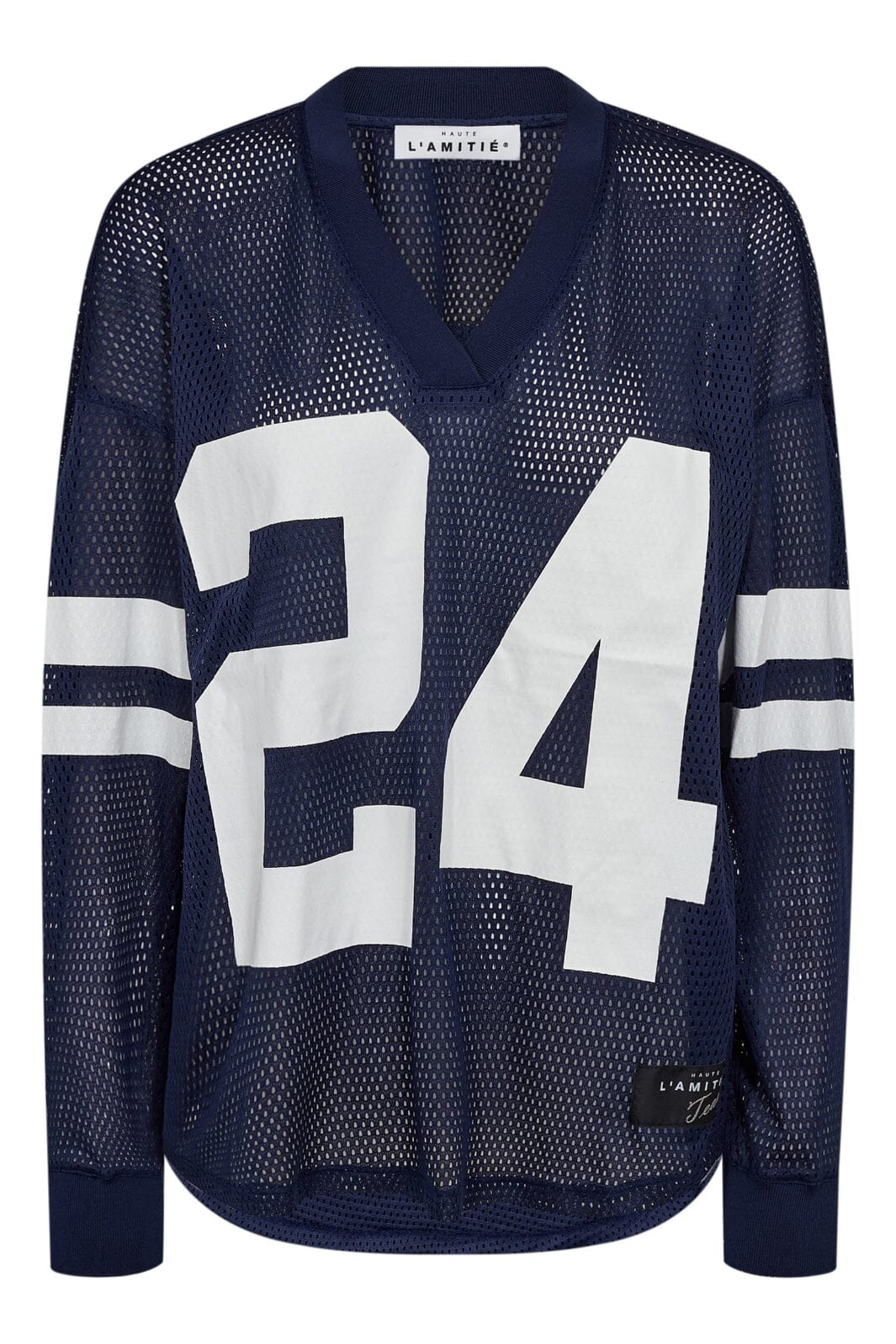 Långärmad t-shirt från Haute L'Amitié i mörkblått mesh-tyg. Den stora vita 24 på bröstet och ränderna på ärmarna ger ett sportigt uttryck med inspiration från lagkläder.
