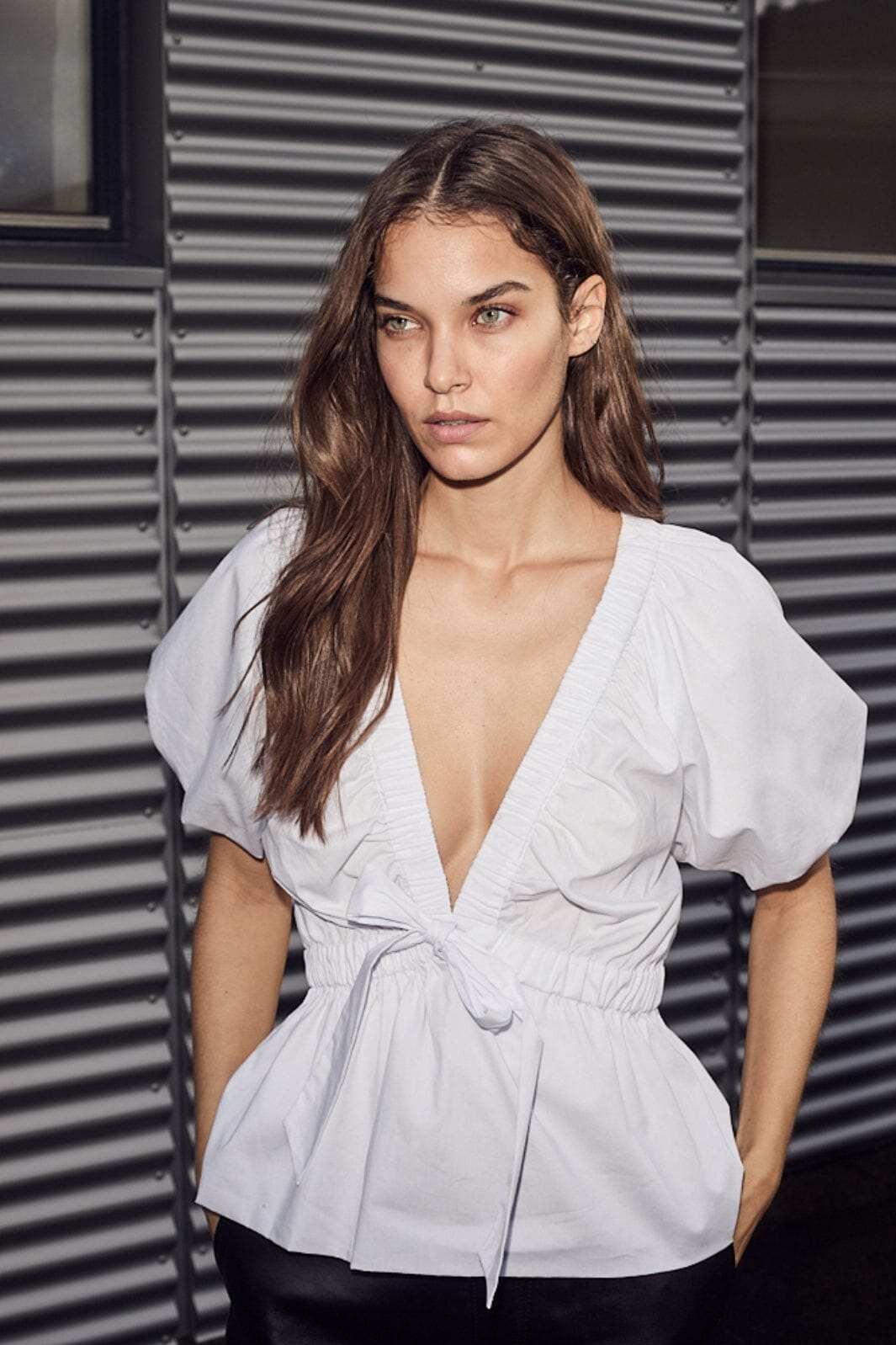 Vit topp från Haute L'Amitié med puffärmar och djup V-ringning. Toppen har ett band i midjan och är tillverkad av en mjuk bomullsblandning med stretch.