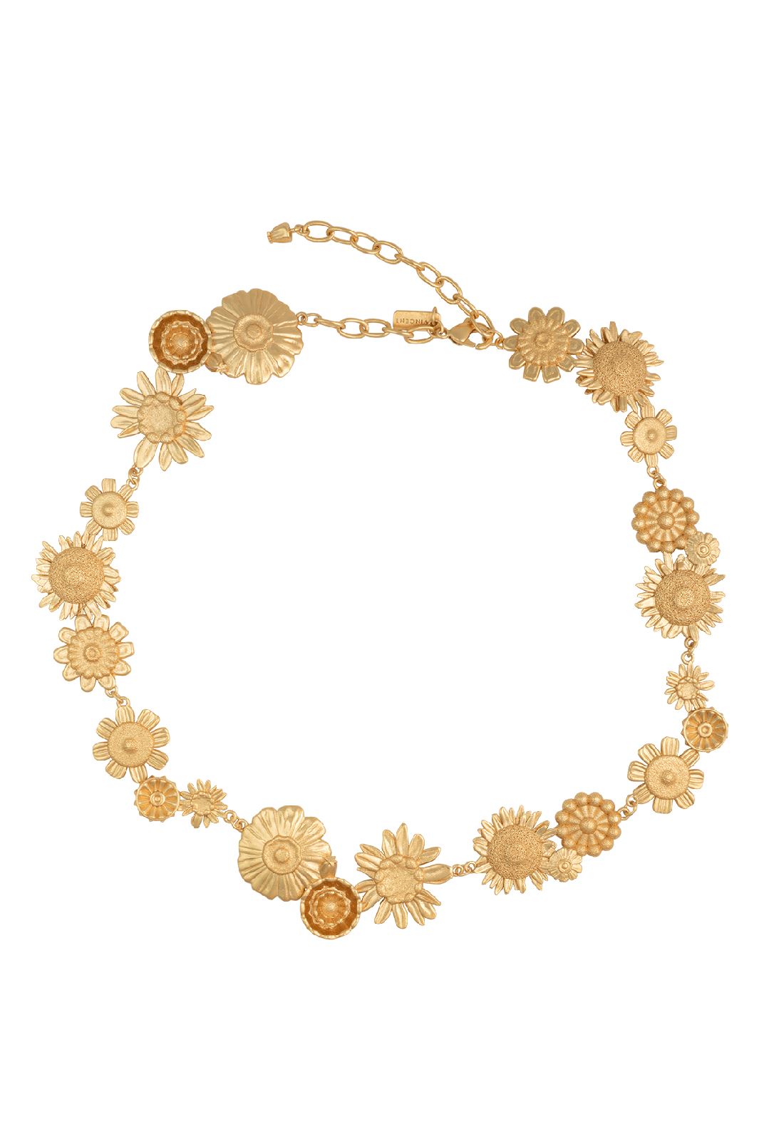 Gyllene halsband från House of Vincent med blommotiv. Smycket har en Garden of Eden-design med detaljerade blommor som bildar en sammanhängande kedja runt halsen.