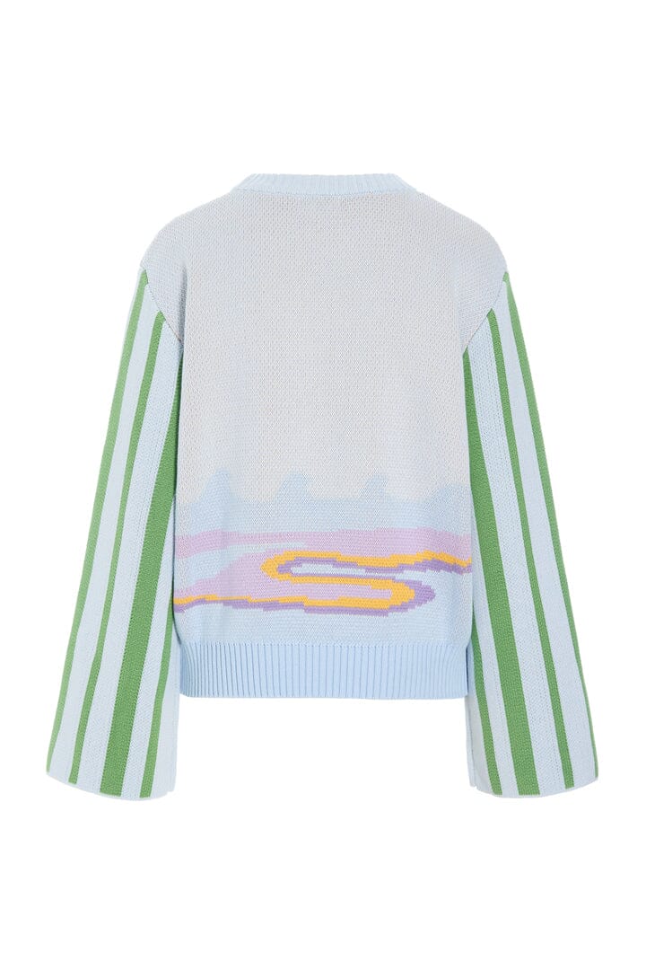 Blus från Hunkøn i färgen Blue Sea. Den har ett broderat motiv med sol och båt på framsidan och vertikala ränder på ärmarna.