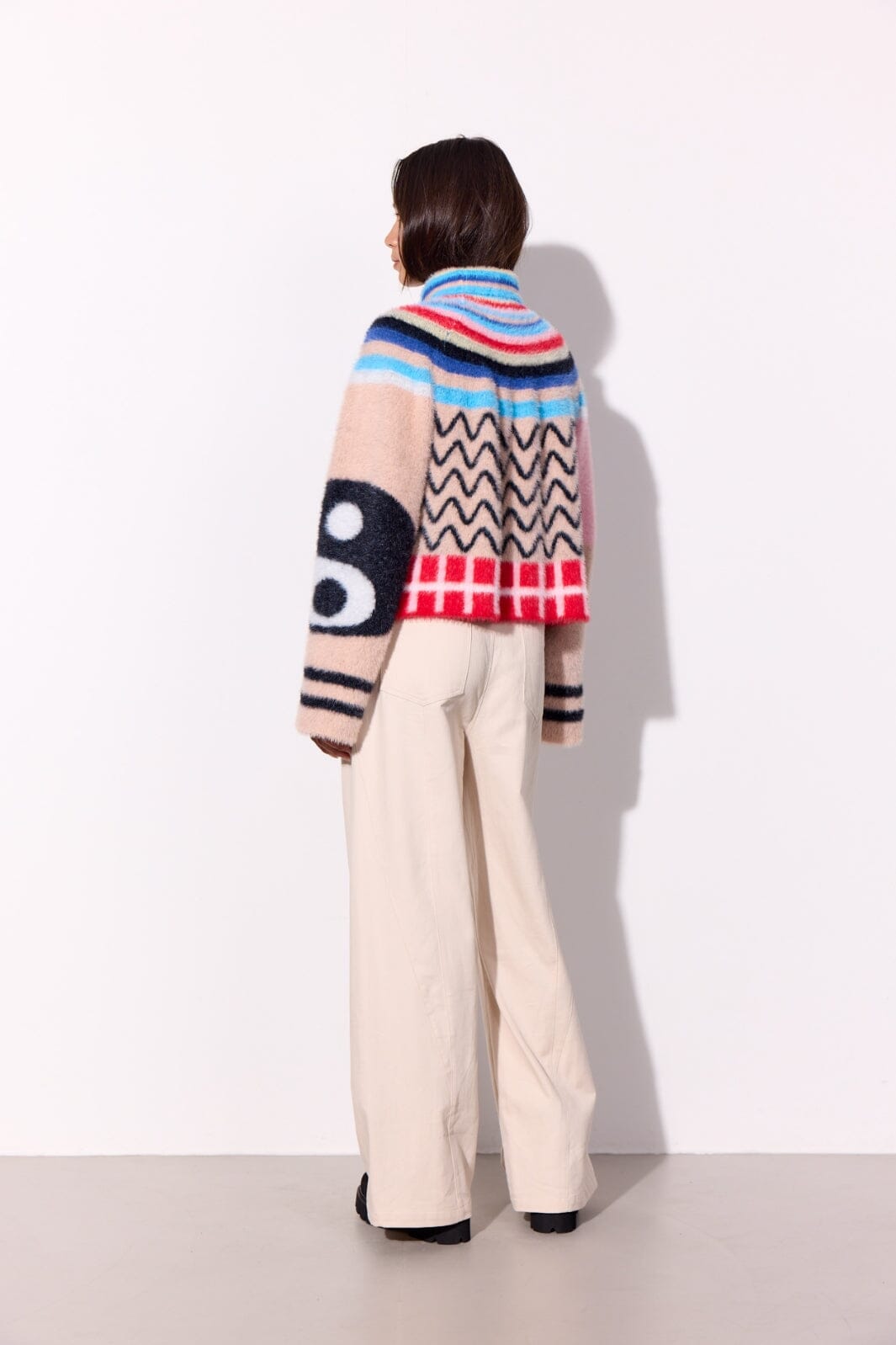 Hunkön Kitty Blouse är en kort, mjuk stickad blus med ett lekfullt och färgglatt mönster.