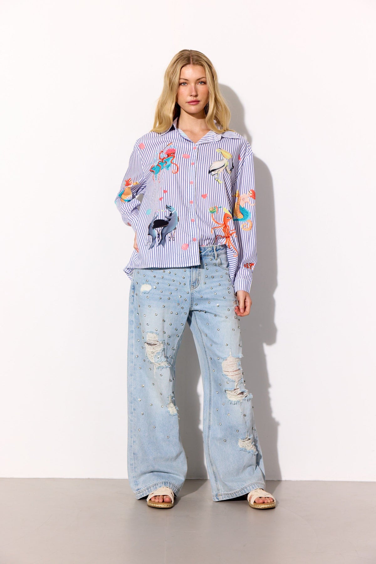 Ljusblå denimjeans från Hunkøn med små nitar framtill. Jeansen passar både för avslappnade vardagar och festliga tillfällen.