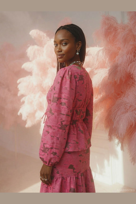 Lång kjol från Hypedrop i rosa med kamouflagemönster i mörkare nyanser. Kjolen har volangdetalj nedtill och knytband i sidan.