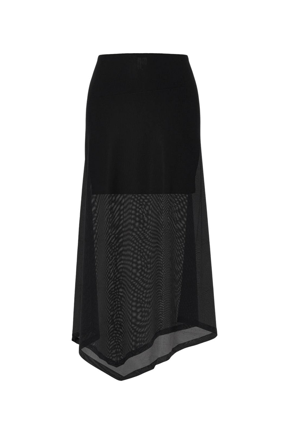 Svart meshkjol från Hypedrop med asymmetrisk kant. Den långa kjolen har hög midja och en genomskinlig design som skapar djup och kontrast i tyget.