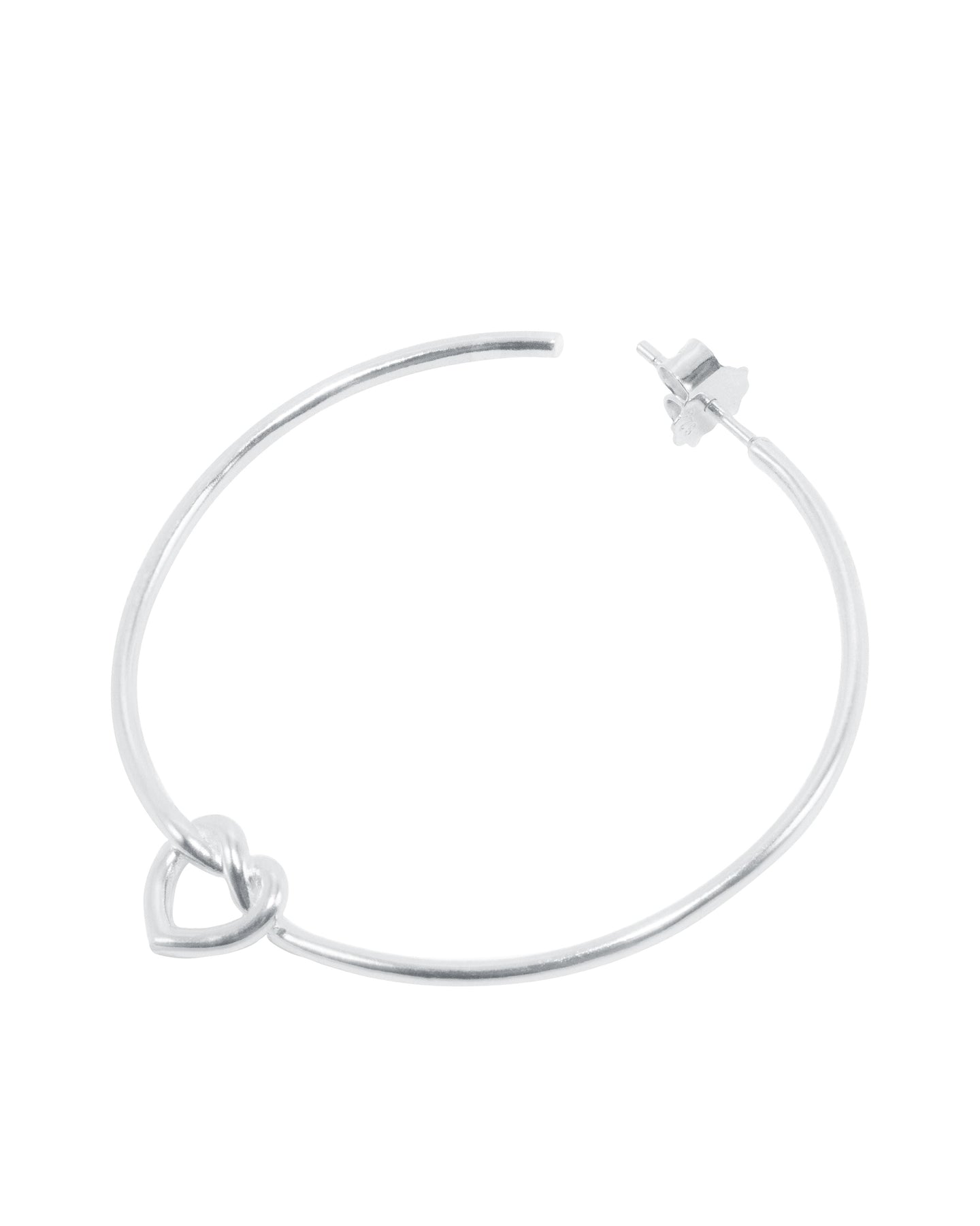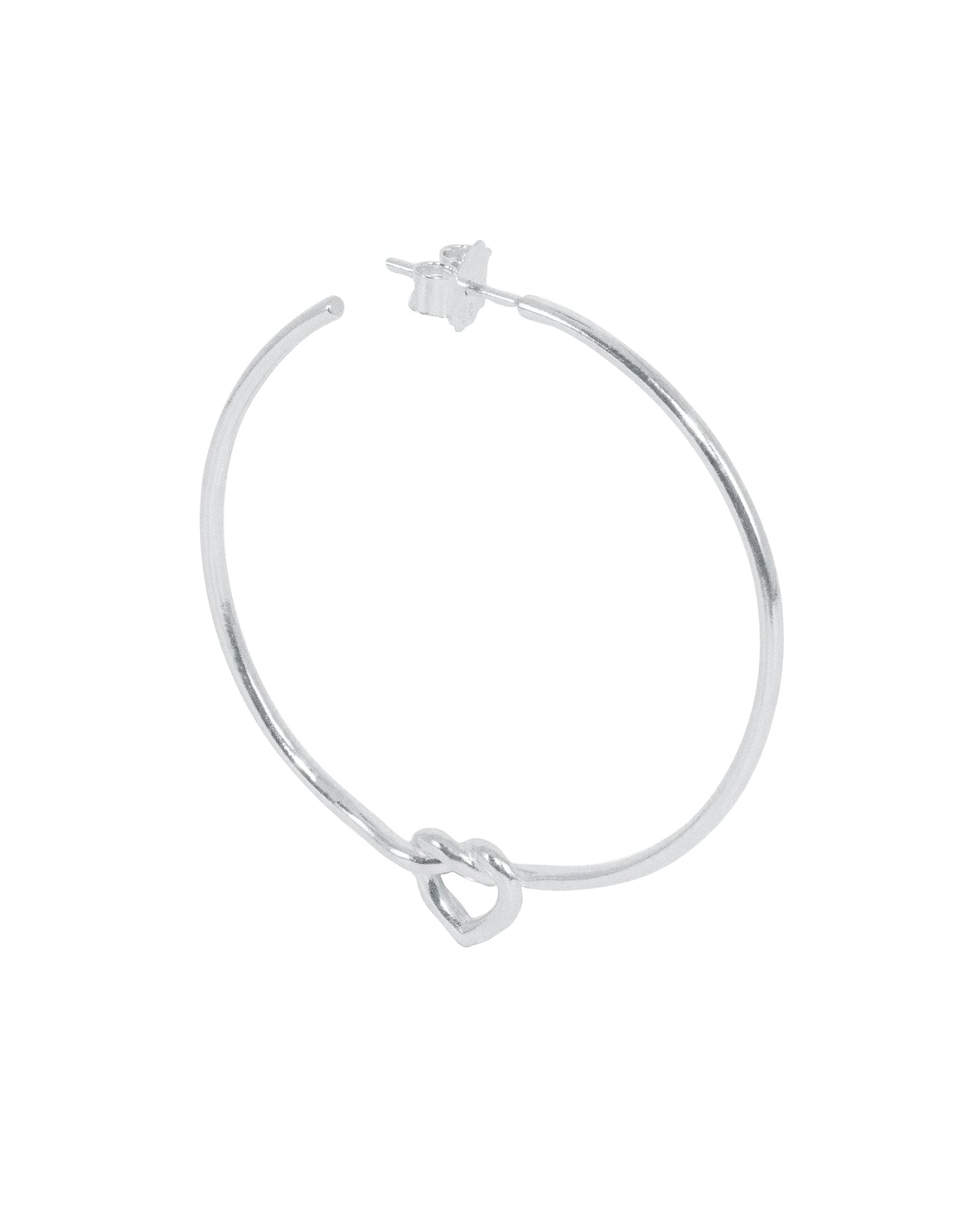 Örhänge från Jane Kønig, tillverkat av sterlingsilver med en stor knuten hjärt-design. Hjärtat sitter på en rund båge och fungerar som ett dekorativt element.