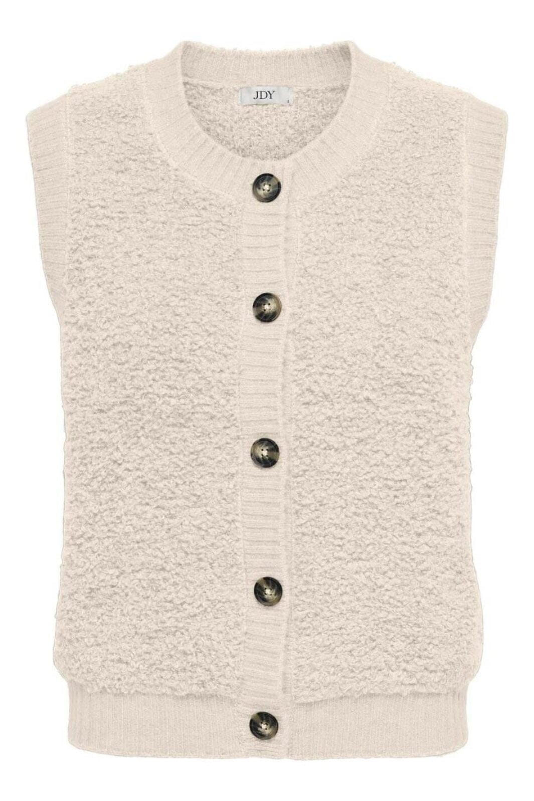 Ärmlös väst från JDY i en ljus birch-nyans. Västen har en strukturerad yta i slätstickning med ribbkanter vid krage och nederkant samt praktisk knäppning framtill.