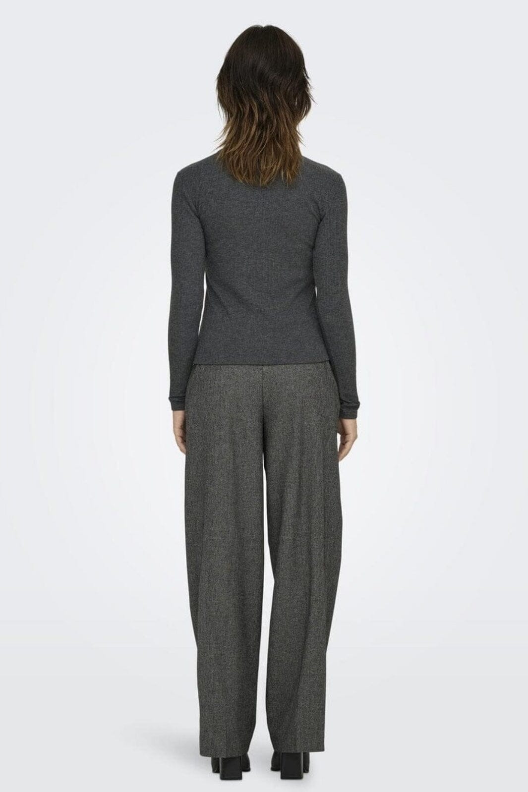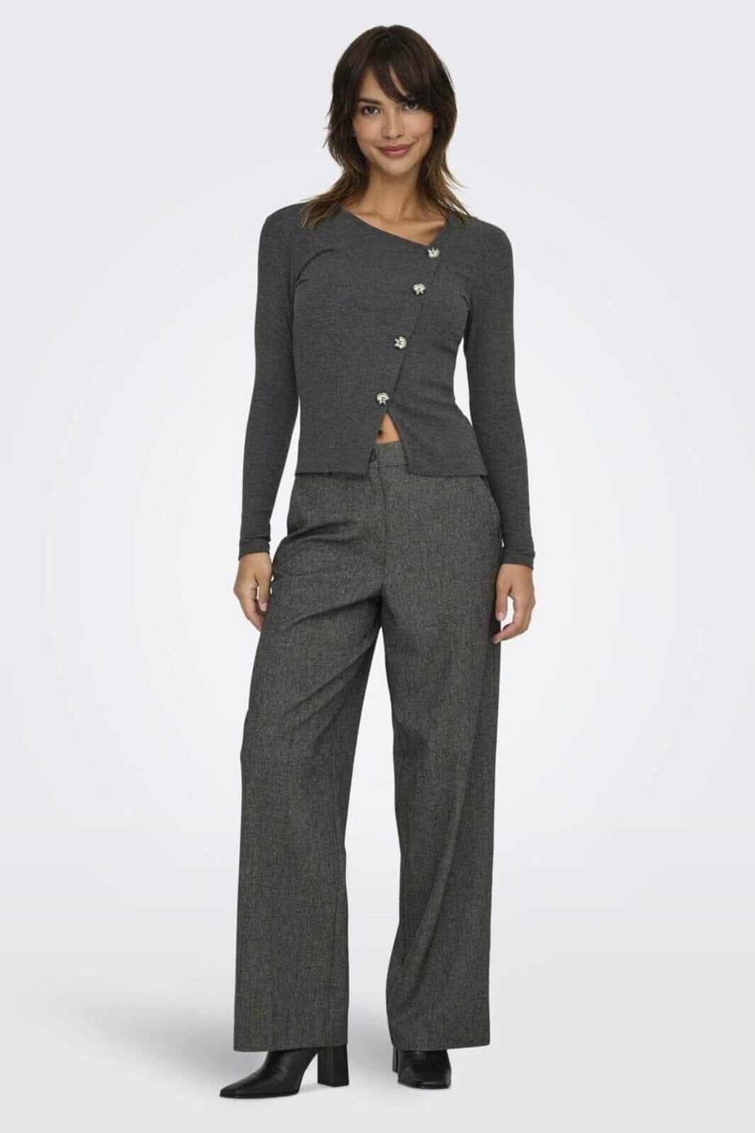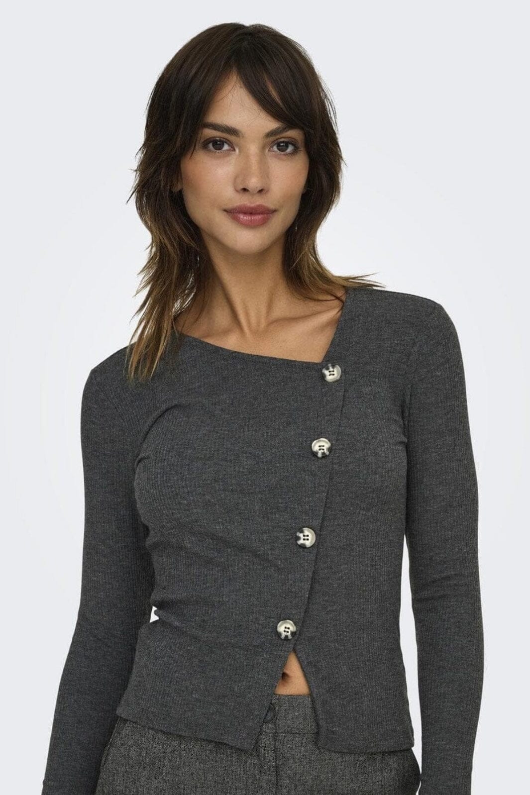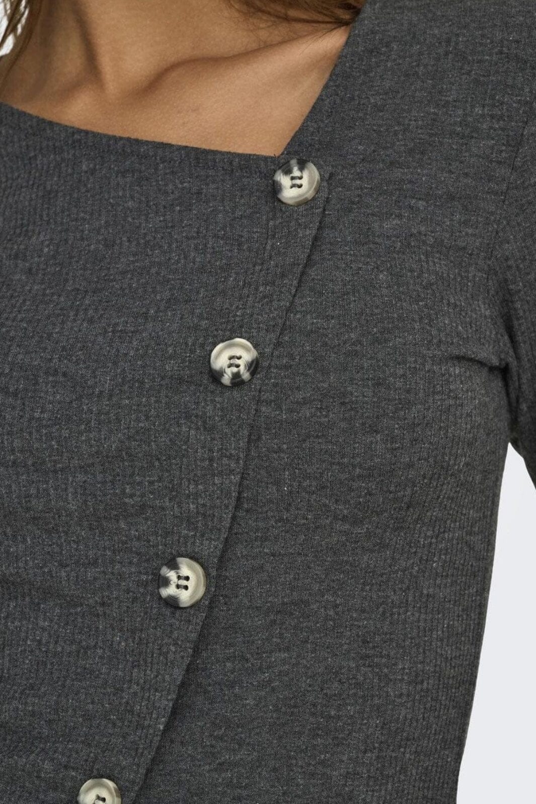 Mörkgrå topp från JDY med långa ärmar och asymmetrisk knapplåsning. Den ribbade strukturen ger toppen en bra passform, medan den gråmelerade nyansen är lätt att styla.