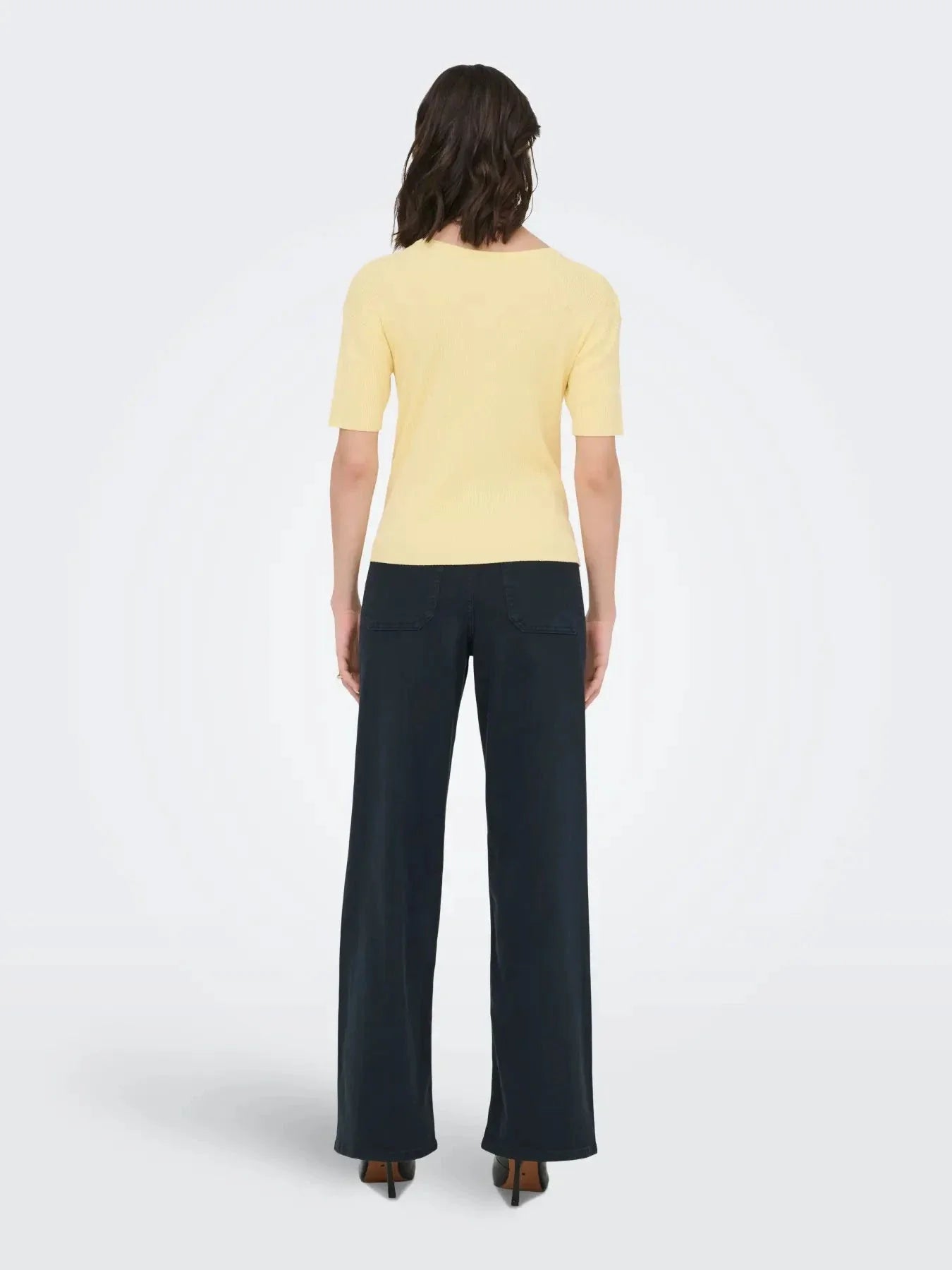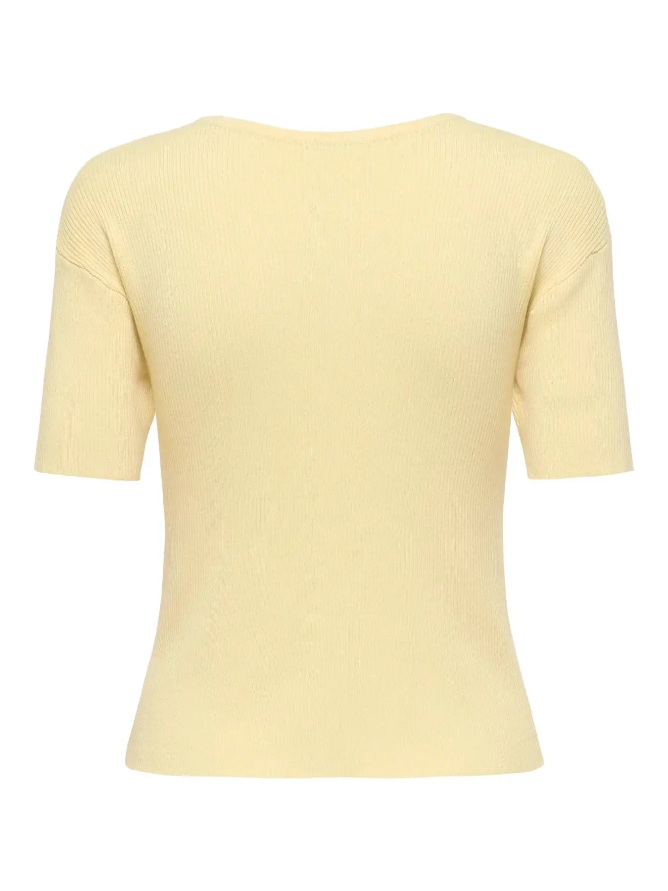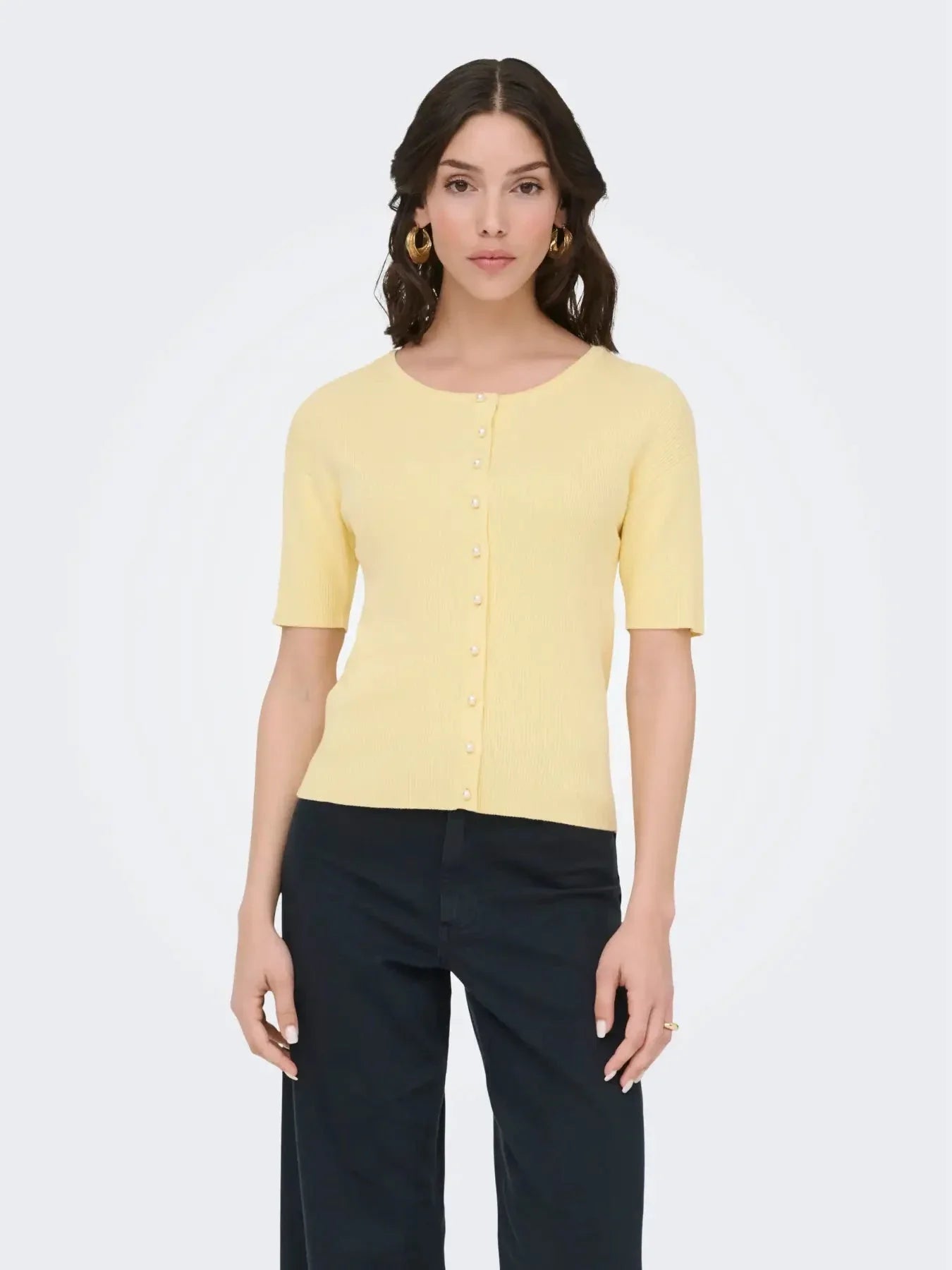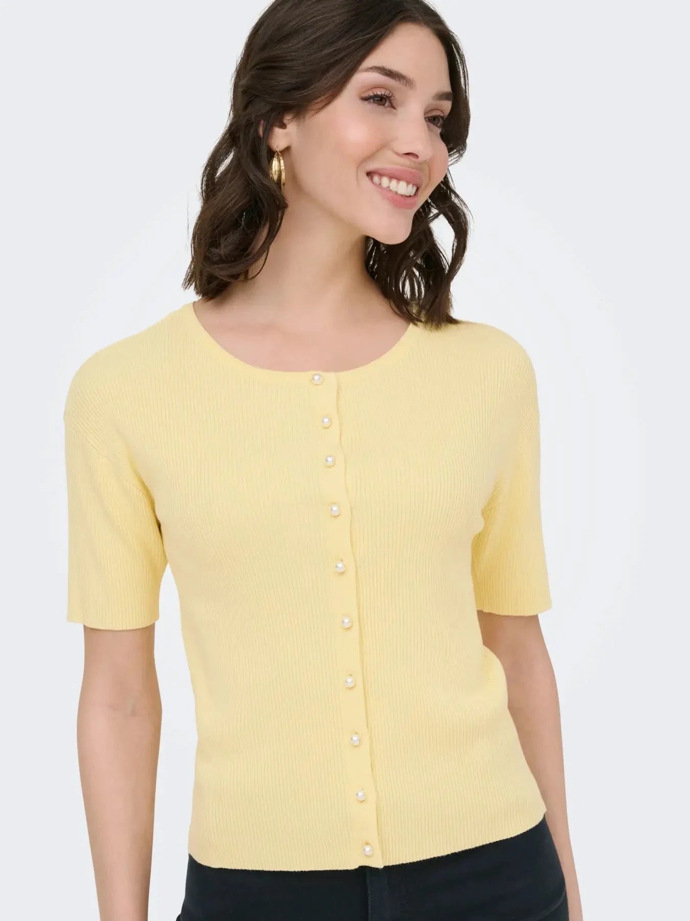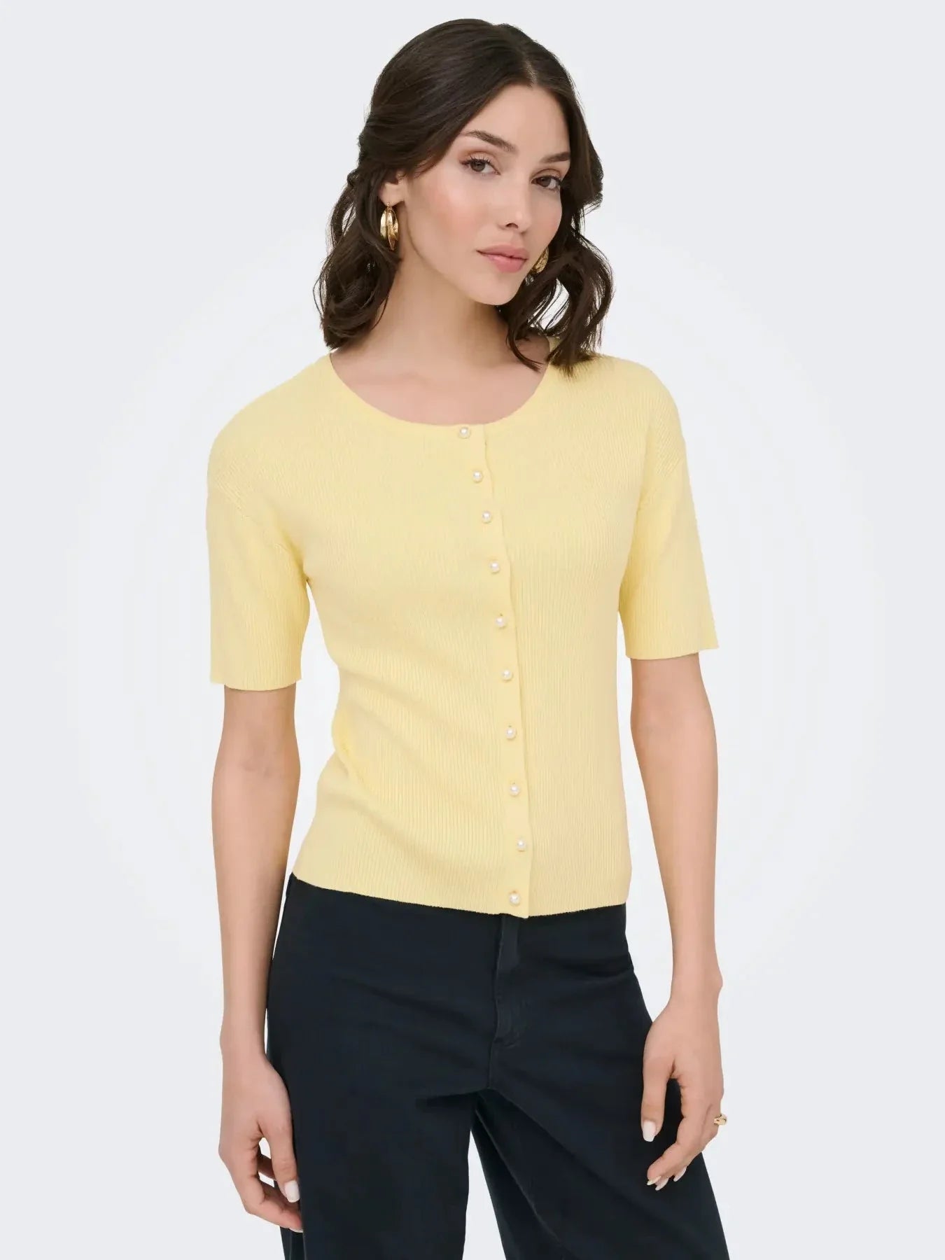 Ljus cremefärgad kofta från JDY med korta ärmar och pärlknappar längs framsidan. Koftan har en rund halsringning och en slim fit-passform.
