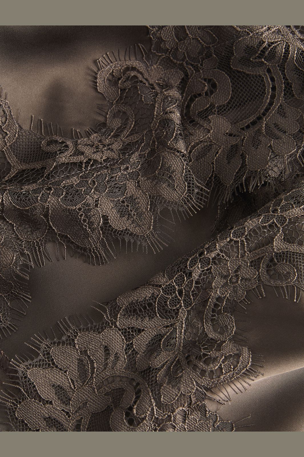 Asymmetrisk satinkjol från Jjxx i en mörkbrun nyans. Kjolen har en blank yta och en asymmetrisk kant med spetsdetaljer.