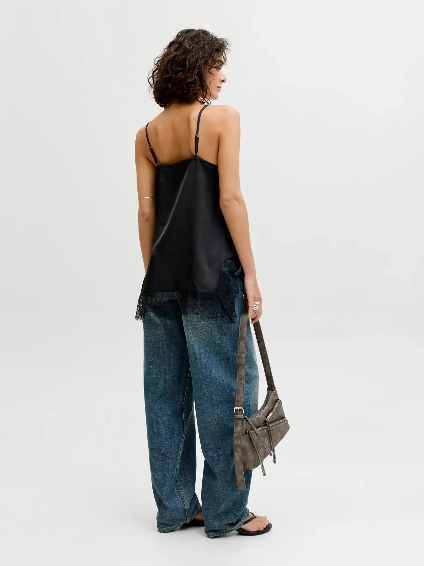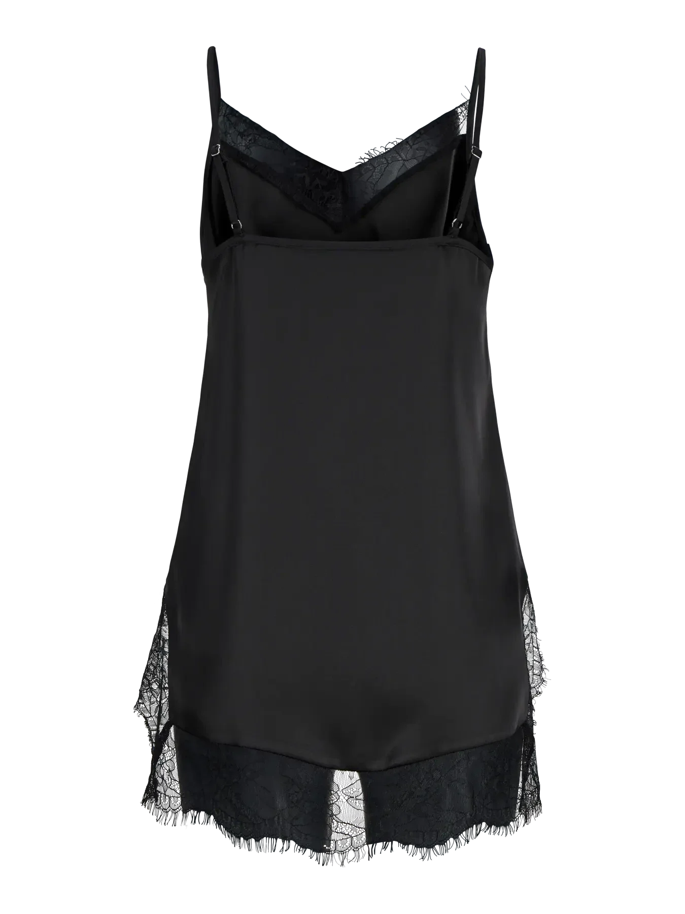 Svart satintopp från Jjxx med V-ringning och spetskant. Toppen har tunna spaghetti-band och en lös passform.