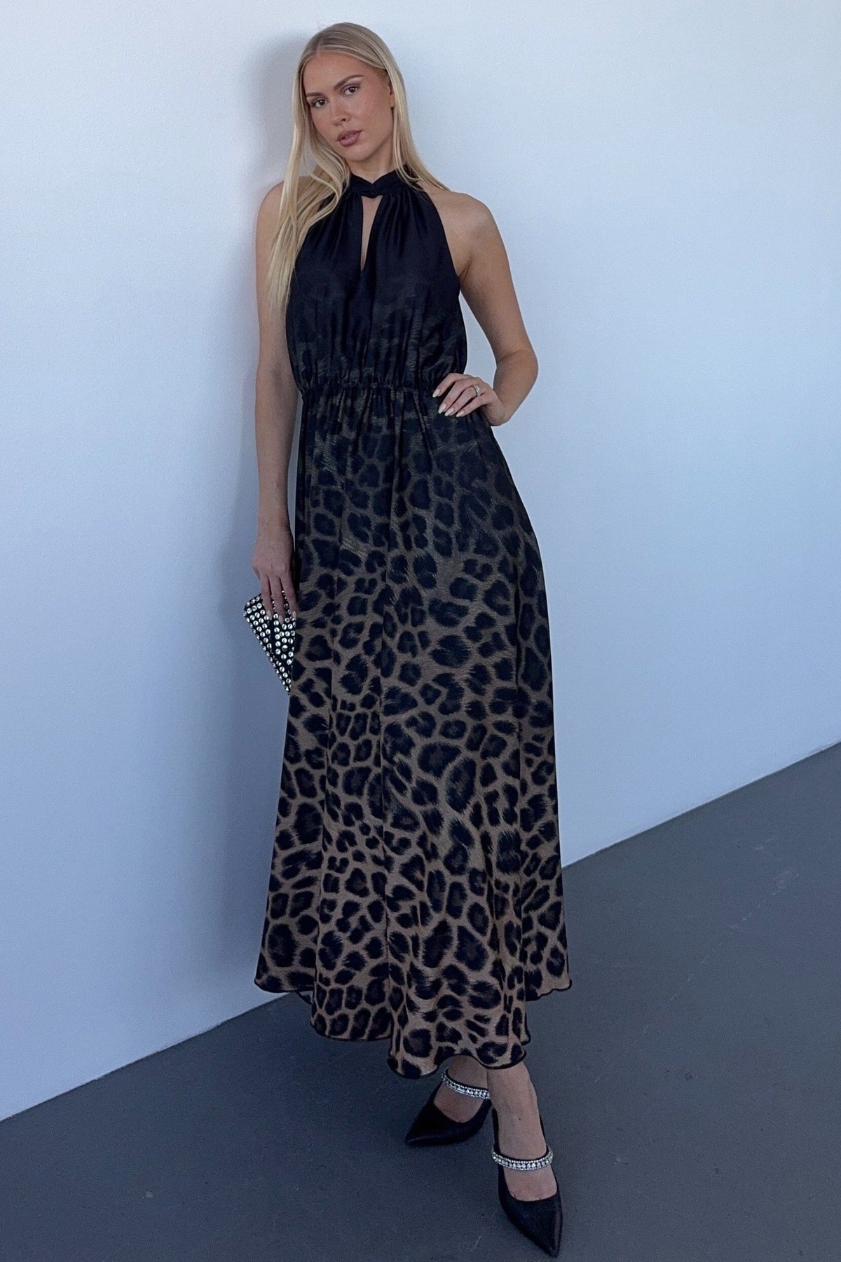 Golvlång klänning från Karmamia i svart och beige gradient leopardmönster. Klänningen har en V-ringning kombinerad med halterneck och en elastisk midja som ger bra rörelsefrihet.