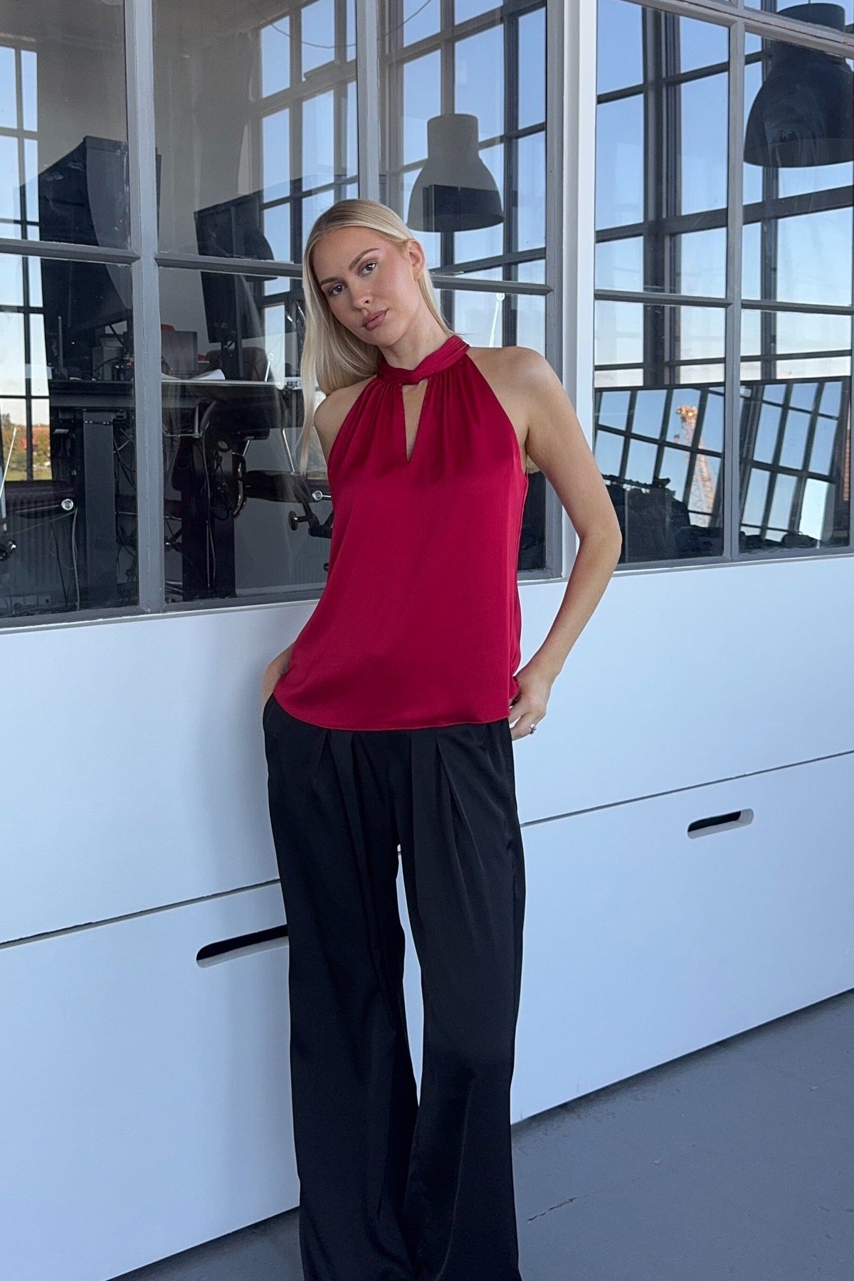 Röd topp från Karmamia med hög hals och volangdetaljer. Toppen har en djup V-ringning och snörning vid halsen. Den kan stylas med Savannah-nederdelen eller byxor.