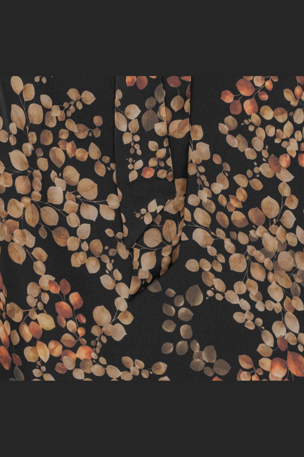 Lång kjol från Karmamia med blommönster i bruna och orange nyanser på svart bakgrund. Den har volangkant nertill och bindband i midjan.