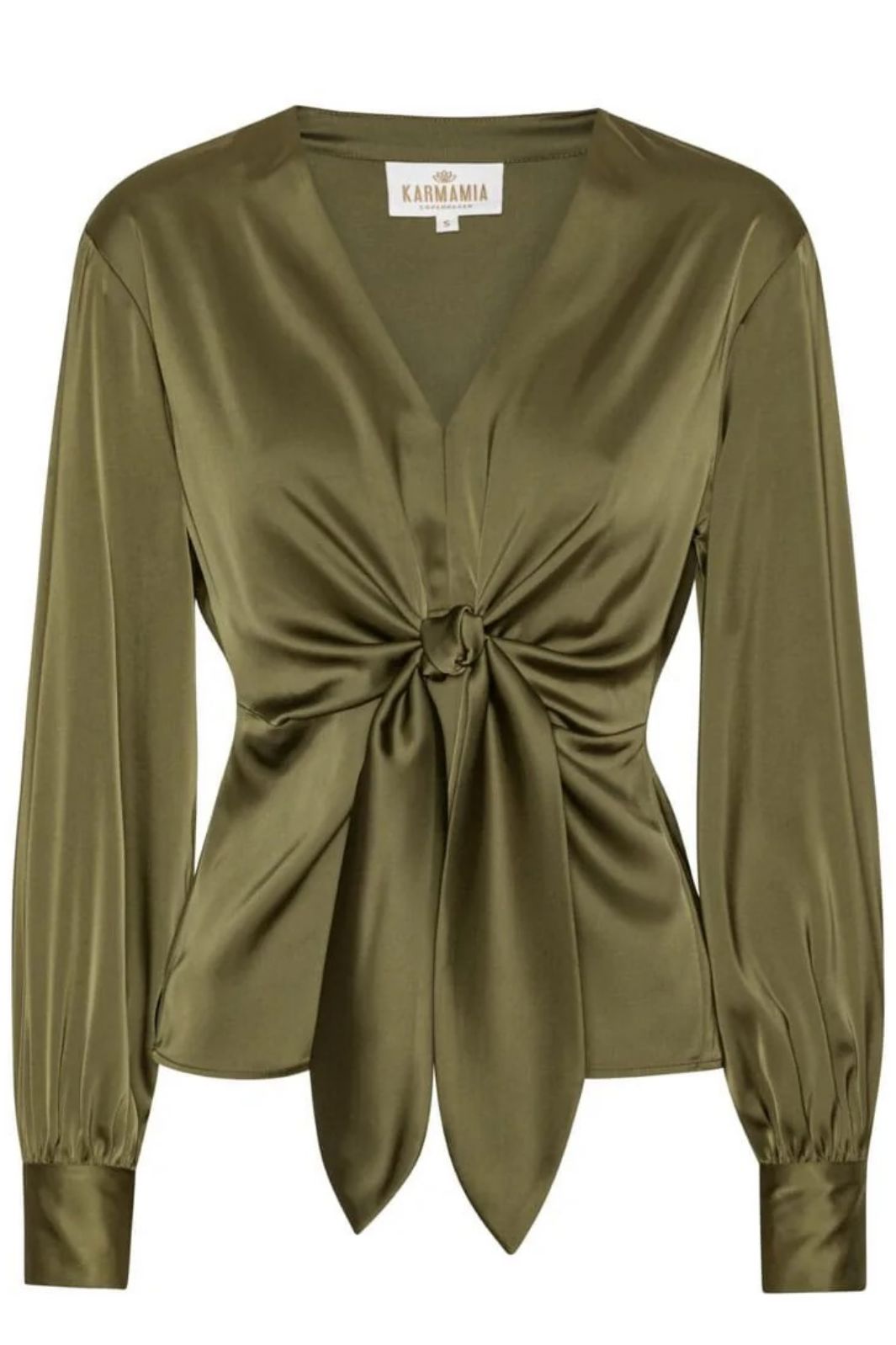 Olivgrön blus från Karmamia med V-hals och knutdetalj fram. Blusen har långa ärmar med puffeffekt vid handlederna och ett blankt, slätt tyg.