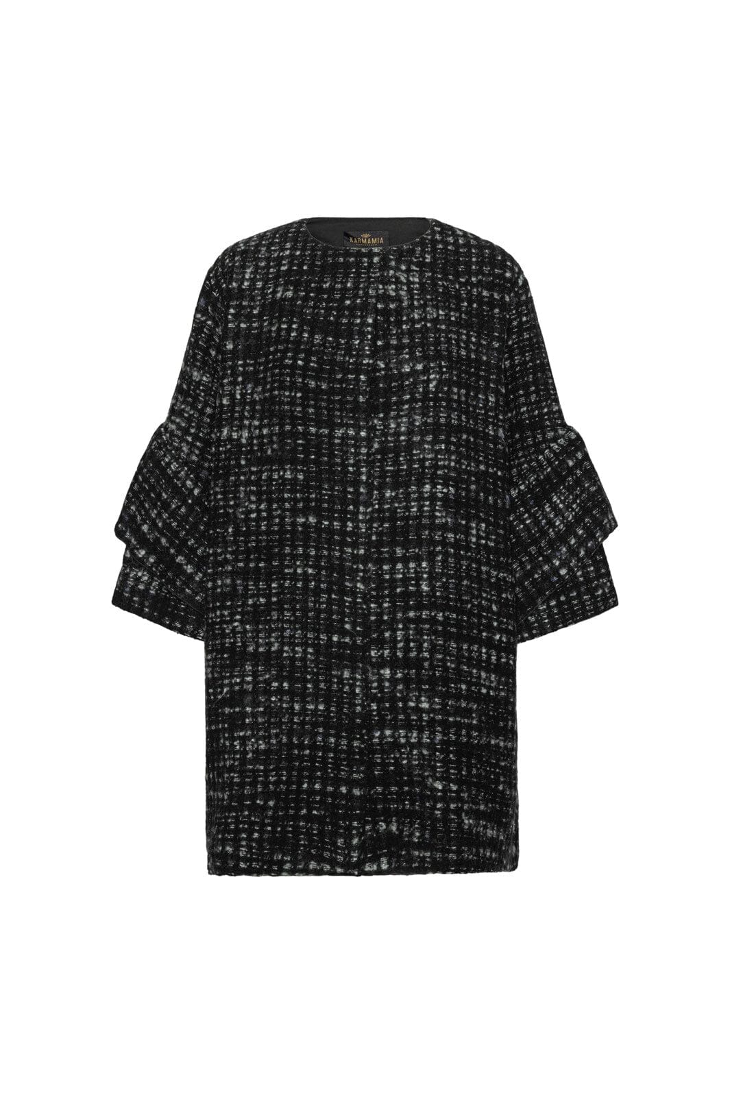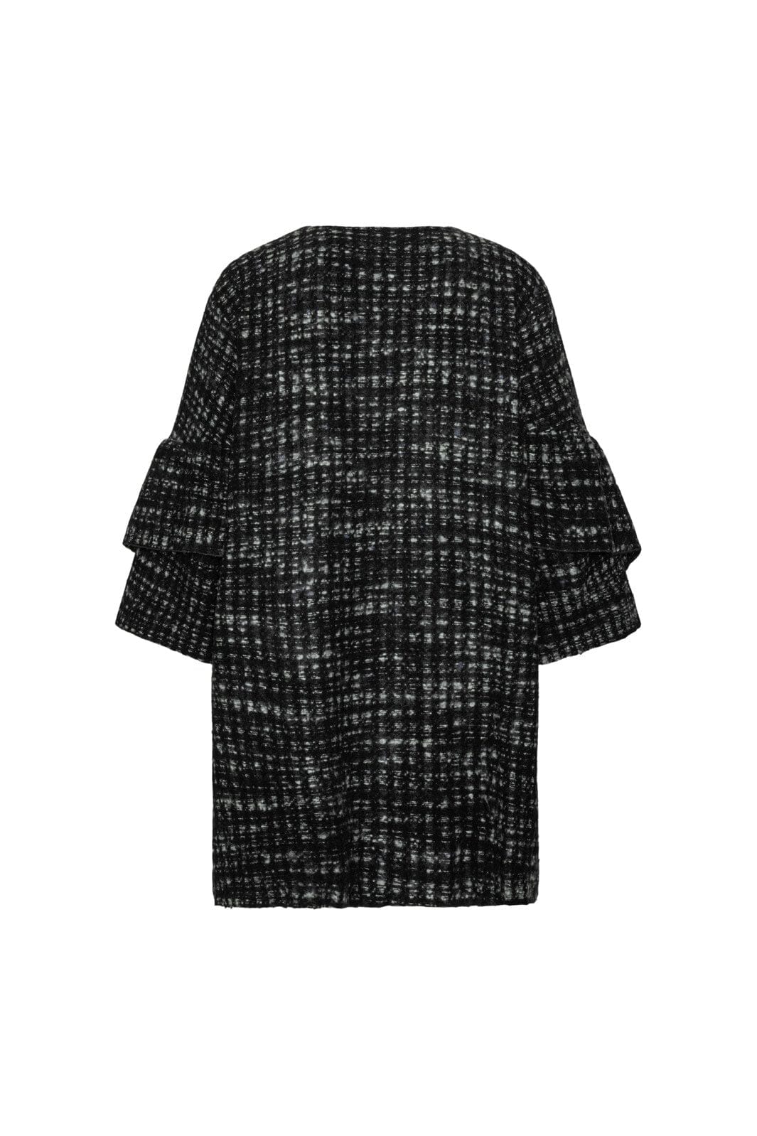 Svart blazer från Karmamia med rutmönster och djup V-urringning. Jackan har 3/4 ärmar och knappar som stängning. Den kan användas till både formella och festliga tillfällen.
